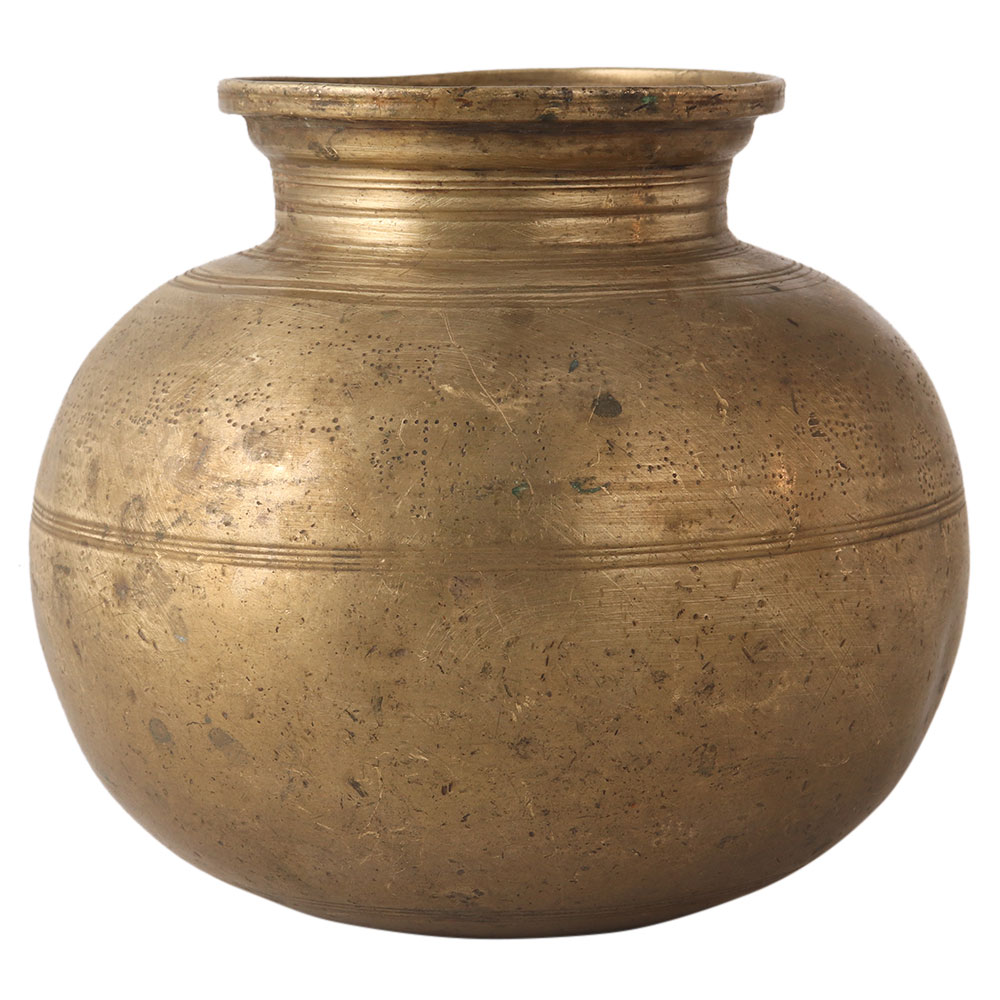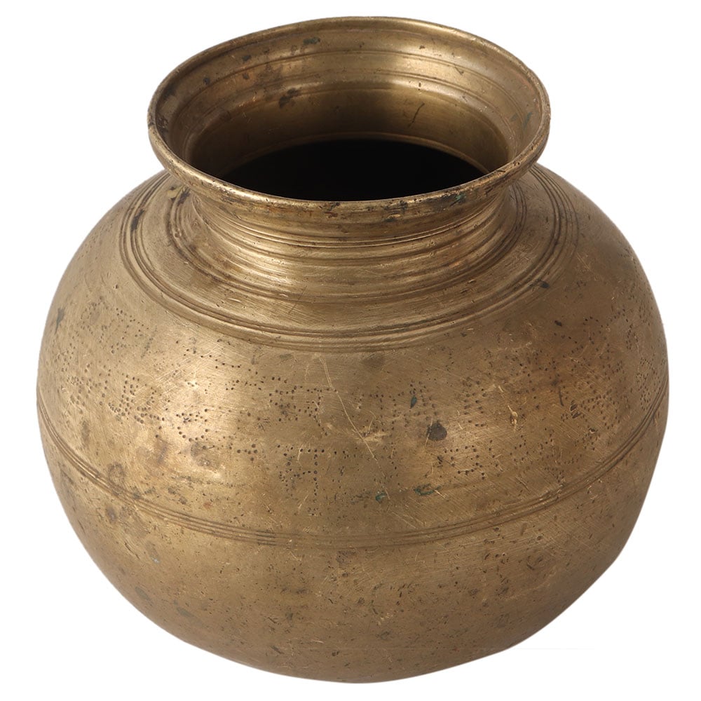 The brass holy water pot has a round shape. It is handmade by skilled Indian craftsmen in Gujarat. It has a line running through the neck and the centre. It has a flat surface. Use it for worshipping God, as a home decoration or as a wedding gift.