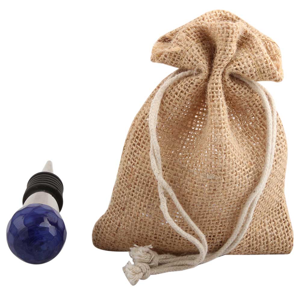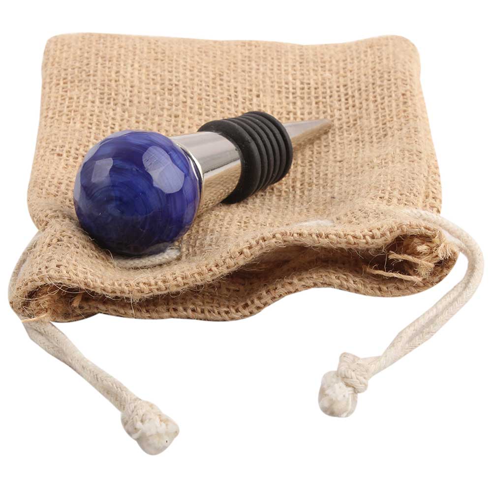 Round Navy Blue Glass Wine Stopper. Zinc Alloy Wine Bottle Stopper with Attractive Jute Bag Packaging.