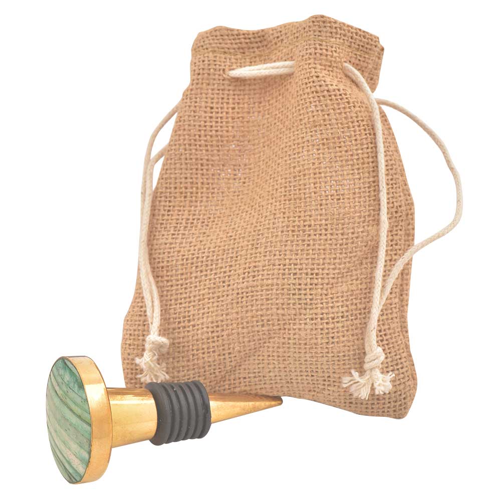 Round Sea Green Metal And Bone Wine Stopper. Zinc Alloy Wine Bottle Stopper with Attractive Jute Bag Packaging.
