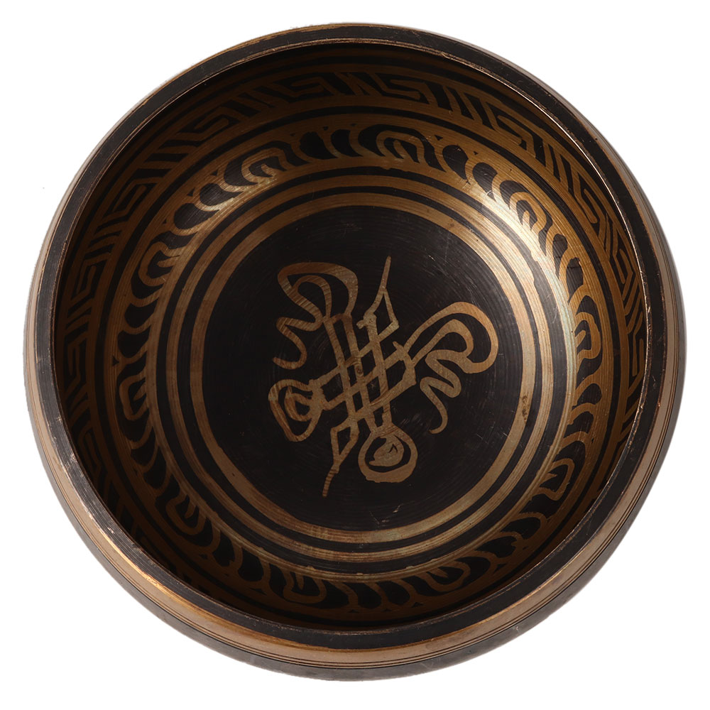 A round Tibetan Om singing bowl for meditation and decoration. It is made of high quality bell metal. It has engravings of motifs and words in Tibetan language. The patterns have been engraved with gold colour on dark brown surface. It can be used with strikers or a wooden mallet by slowly rotating the mallet in a circular motion around the rim of the bowl. The sound produced by the bowl relaxes the human body and mind and relieves stress. They are often used in schools during yoga classes for meditation.