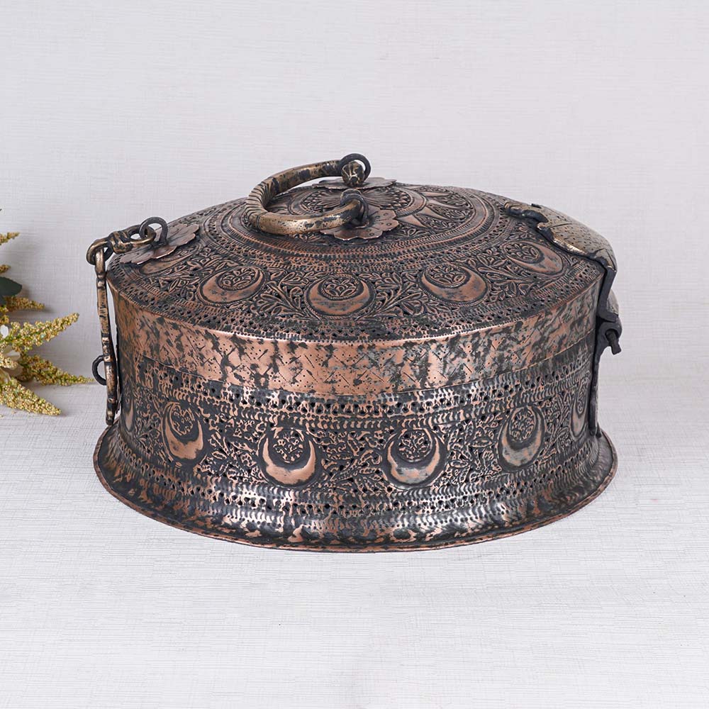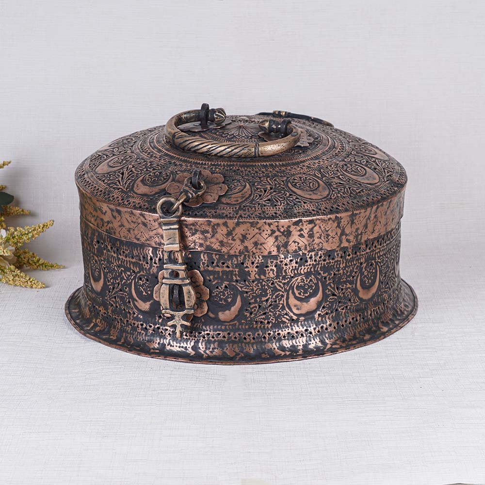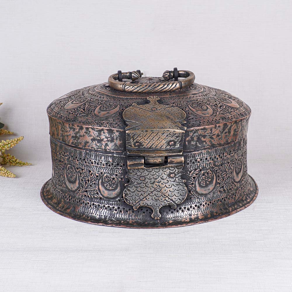 Buy a brass round Paan Daan online a remarkable piece of artistry handcrafted by skilled Indian craftsmen. This stunning paan container showcases a mesmerizing antique finish, adorned with intricate and beautiful designs. Its timeless appeal and traditional charm make it a perfect addition to any setting. The Paan Daan is not only a decorative masterpiece but also a functional item with practicality in mind. It features carefully crafted boxes within to store the various ingredients required for preparing paan, a popular Indian delicacy. The addition of a handle on top and a latch ensures convenience and security. Versatile in its application, this brass round Paan Daan can be displayed with pride in homes, restaurants, hotels, cafes, or offices, enhancing the aesthetic appeal of any space. Its captivating design also makes it a captivating exhibit for museums or exhibitions. Furthermore, this extraordinary piece makes an unforgettable gift for your loved ones on special occasions or during festive celebrations. Its cultural significance and artistic craftsmanship embody the essence of Indian heritage, leaving a lasting impression on the recipient.