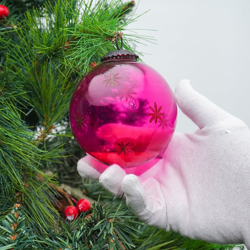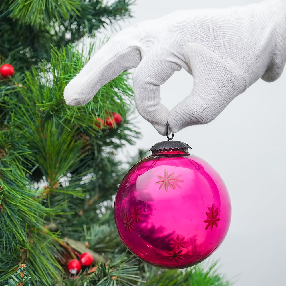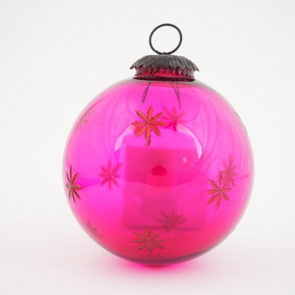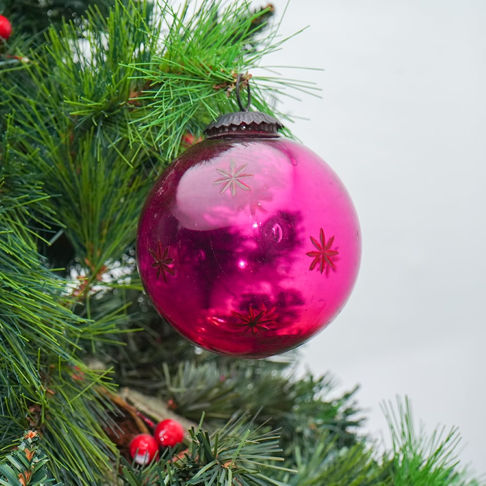 Round Vintage Pink Glass With Star Design Christmas Ornament. Crafted from high-quality glass with a smooth glossy finish, this decorative bauble adds a classic and festive touch to Christmas trees, wreaths, and holiday displays.