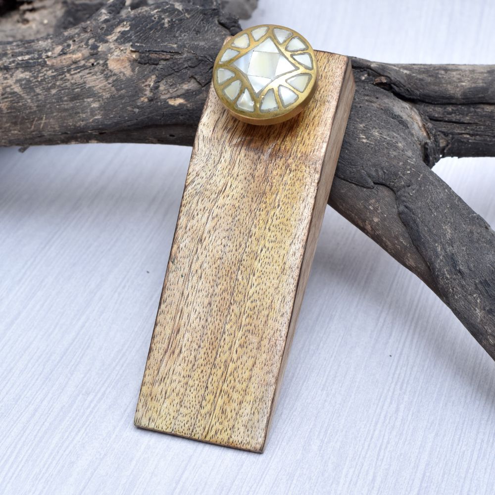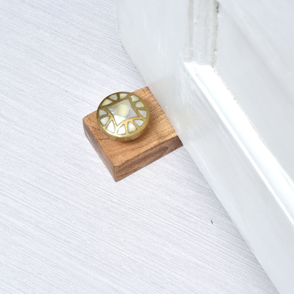 Indianshelf.com for bulk/wholesale orders.Indianshelf.us for personal purchases.Elevate the aesthetic of your home or office with the Round White & Golden Pattern Ceramic Wooden Door Stopper. This thoughtfully designed piece merges beauty with practicality, featuring a ceramic top adorned with an intricate white and golden pattern, all supported by a robust wooden base. It effectively prevents doors from slamming or causing damage, while also serving as a chic accent for your interior décor.
