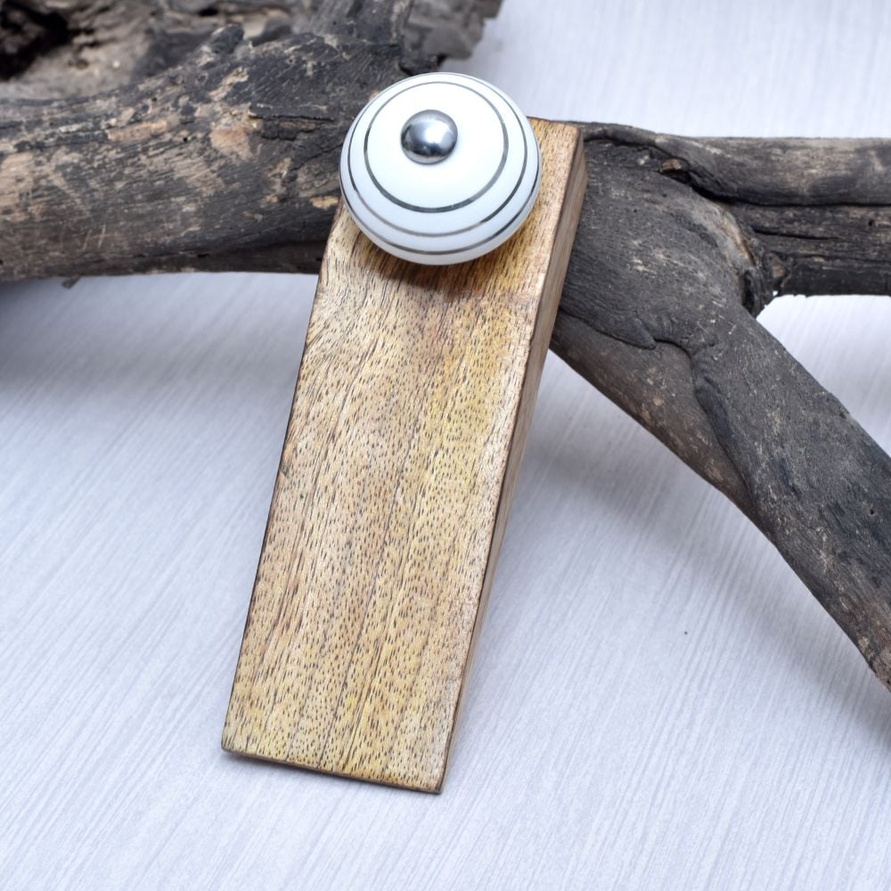 Add a touch of modern elegance and charm to your home with the Round White & Silver Pattern Ceramic Wooden Door Stopper. Designed to blend seamlessly with various interior styles, this beautiful door stopper combines sleek ceramic with natural wood, making it both a functional and decorative piece. Whether you're trying to keep doors open or prevent damage to your walls, this door stopper offers a practical solution with a stylish twist.