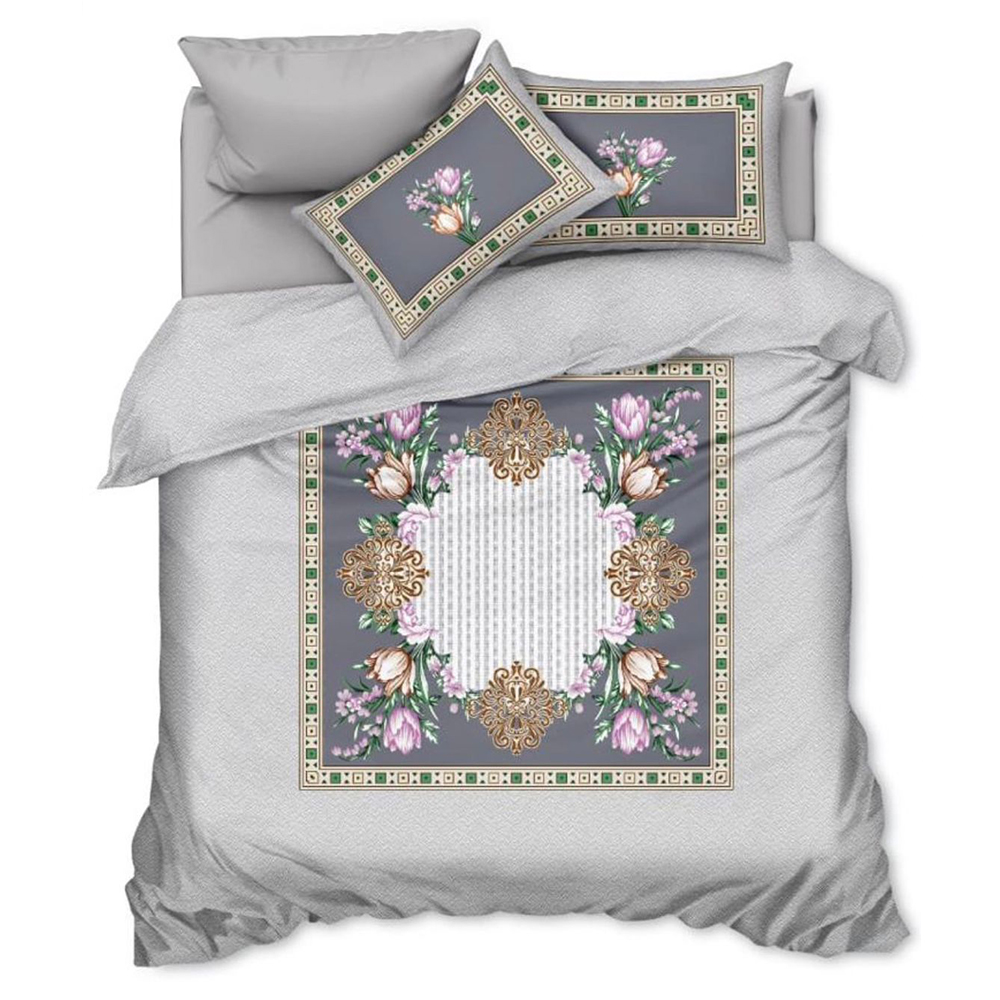 Infuse your bedroom with regal charm and floral elegance using this Royal Grey Queen Size Bedsheet Set. Highlighted by a stunning digital panel print featuring pink and white blossoms against a deep grey base, this design is both graceful and contemporary. Made with high-quality Heavy Glace Cotton, the fabric ensures a smooth, durable, and wrinkle-free experience.The set includes one non-fitted (flat) bedsheet and two matching pillow covers that beautifully coordinate with the central floral motif. Perfect for stylish bedroom makeovers or thoughtful gifting, this set delivers comfort and sophistication in equal measure.