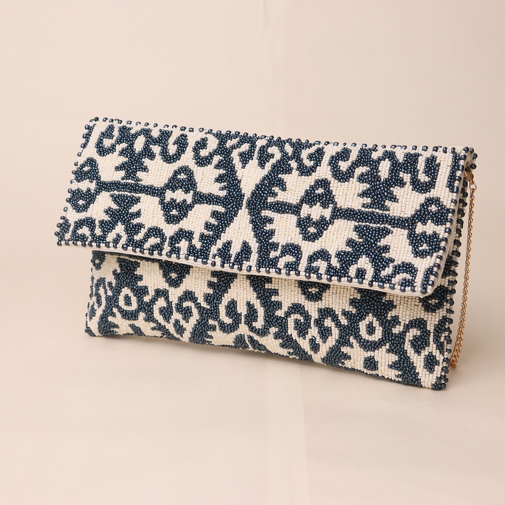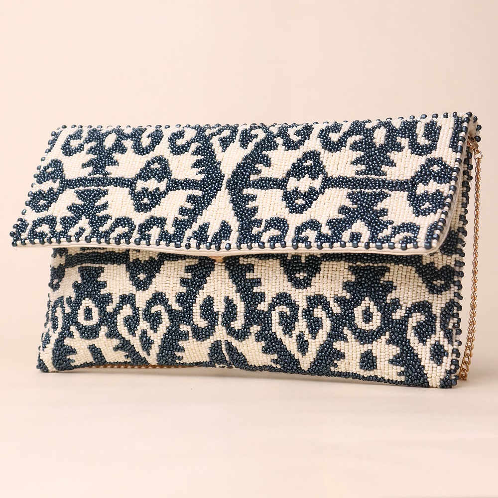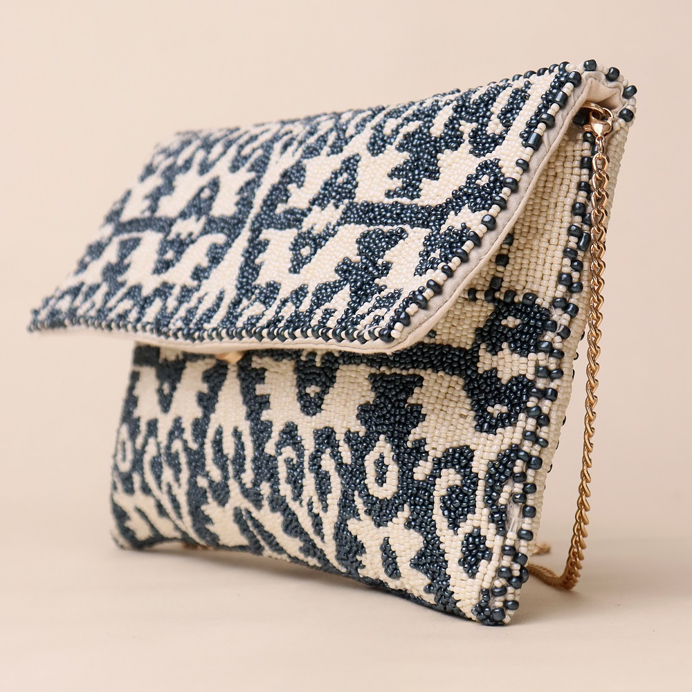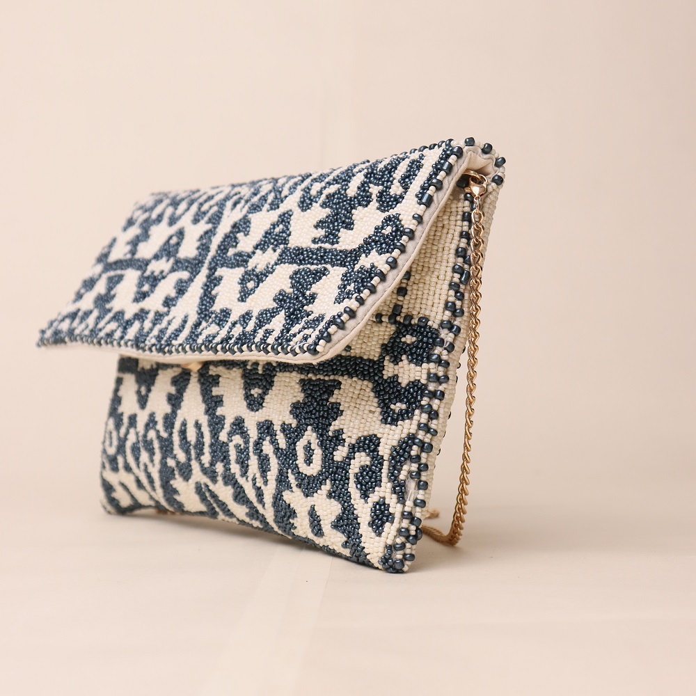 A striking blend of traditional artistry and modern elegance, this hand-beaded sling bag features a captivating ikat-inspired pattern in deep indigo and ivory. The intricate beadwork showcases skilled craftsmanship, while the envelope silhouette adds timeless sophistication. Designed with a detachable gold-tone chain strap, this versatile piece can be worn as a crossbody, shoulder bag, or carried as a clutch. Perfect for cultural events, evening outings, and statement styling.