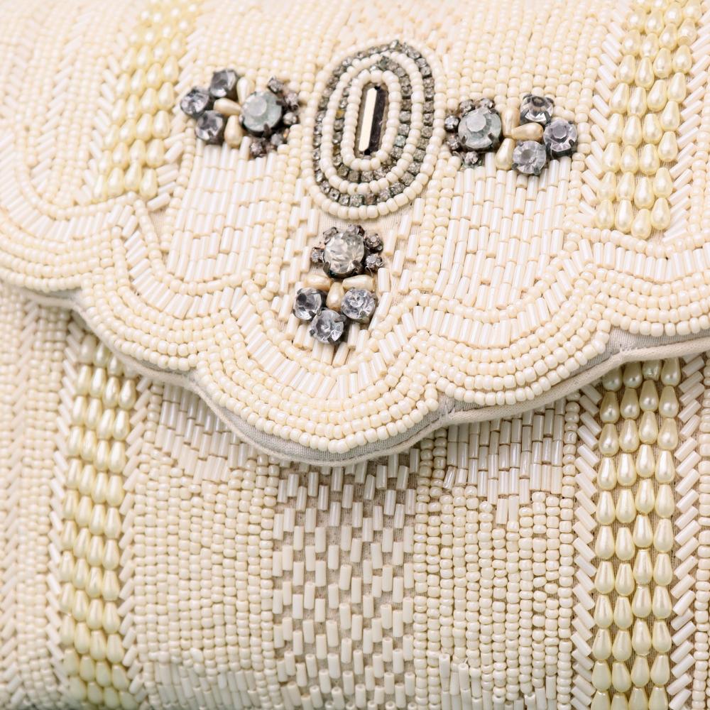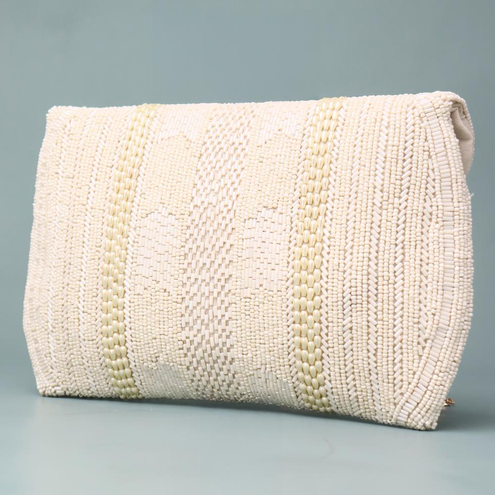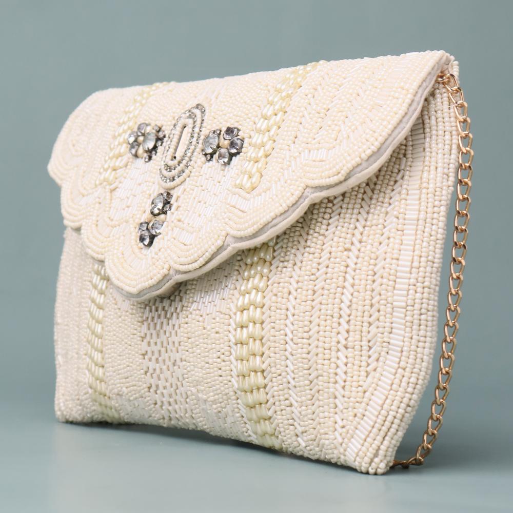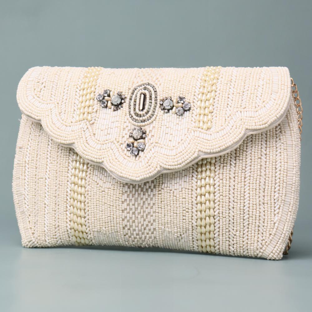 Royal Ivory Bloom Hand-Beaded Clutch with Embellished Flap and Chain Strap