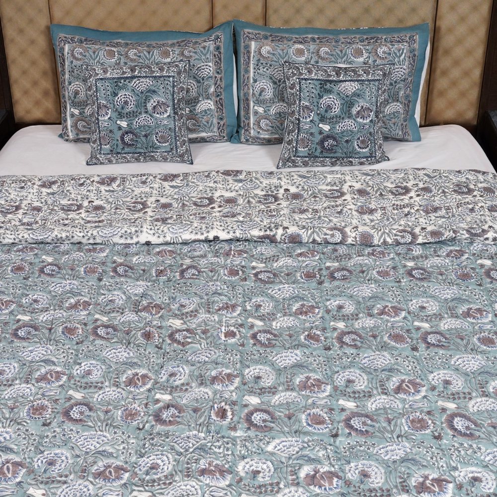 This grey and blue Malmal (Voile) quilt features classic paisley block prints that blend elegance with artisan craftsmanship. Soft, breathable, and beautifully finished, it brings understated sophistication to your bedroom décor. Expertly handmade and quality-checked by Indianshelf for authentic artistry and long-lasting comfort.