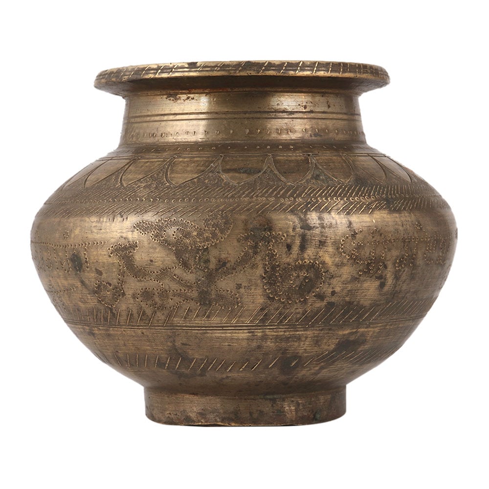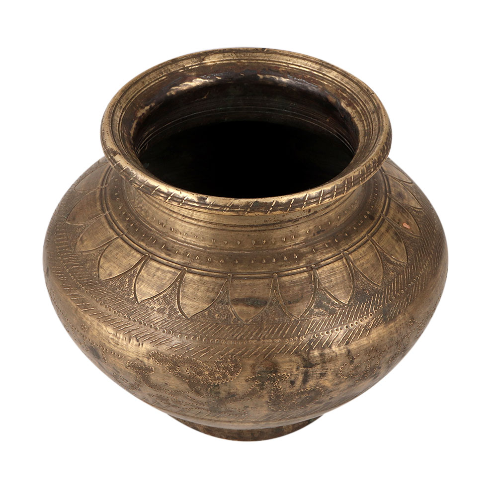 This exquisite brass water pot in an antique brown finish is skillfully engraved with captivating designs. Handcrafted by talented Indian artisans, this pot is a true testament to their craftsmanship and attention to detail. Its unique appearance instantly draws the eye and adds a touch of elegance to any space. This brass pot has been an integral part of Indian households and temples, serving a multitude of purposes. It is traditionally used to offer water to deities, including the sun god and Shivling. Additionally, it is employed to store sacred water from the revered river Ganga and plays a significant role in Hindu rituals, auspicious functions, and havans. This pot can be used as an indoor flower pot, bringing a charming element to your living room or patio garden. It also serves as a thoughtful gift for your loved ones on special, festive, or auspicious occasions, allowing them to embrace the rich cultural heritage of India while adding a touch of splendour to their own space.