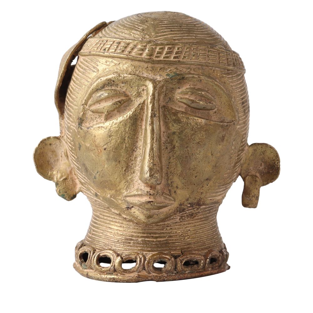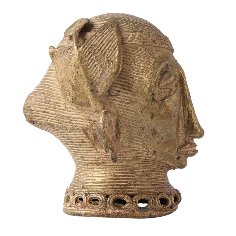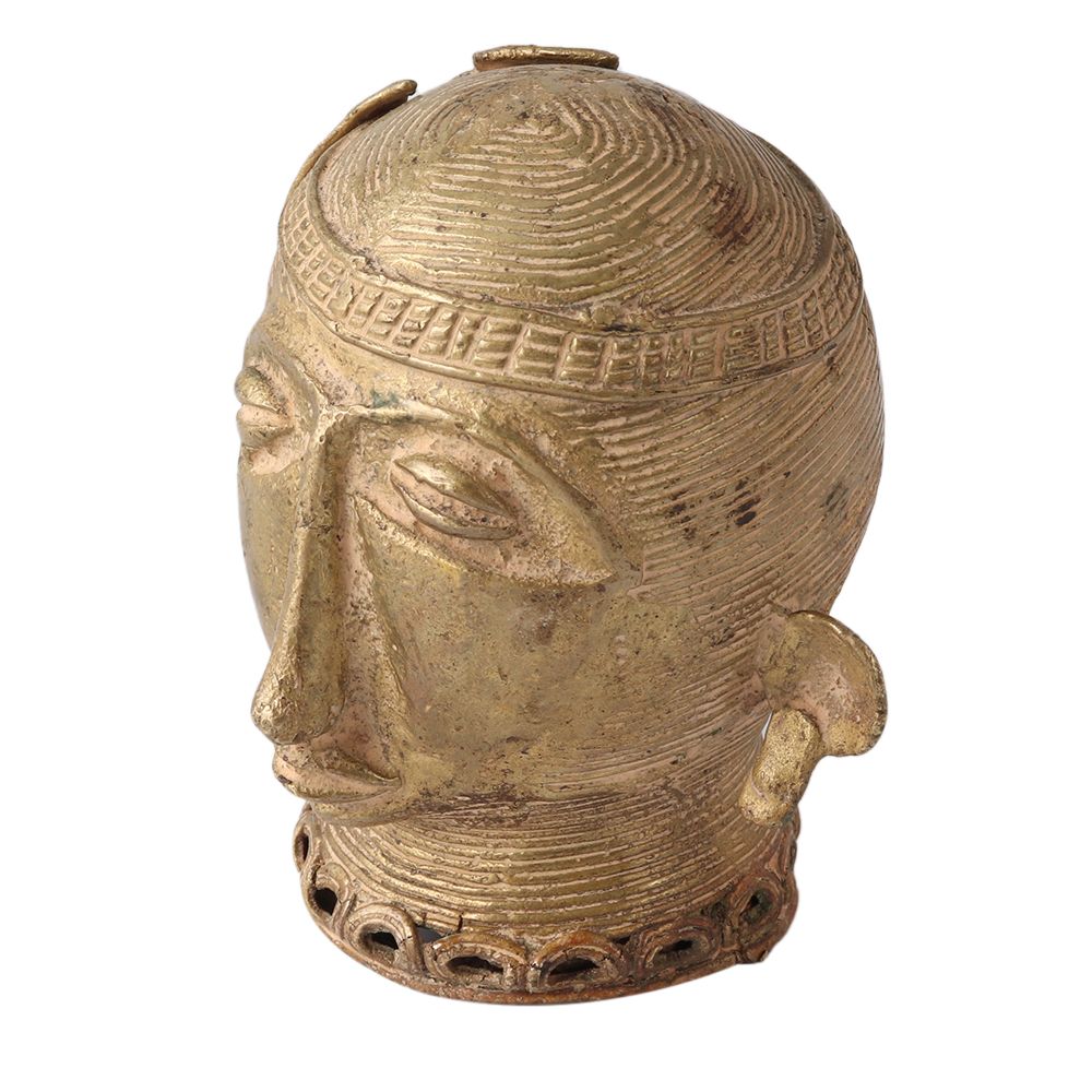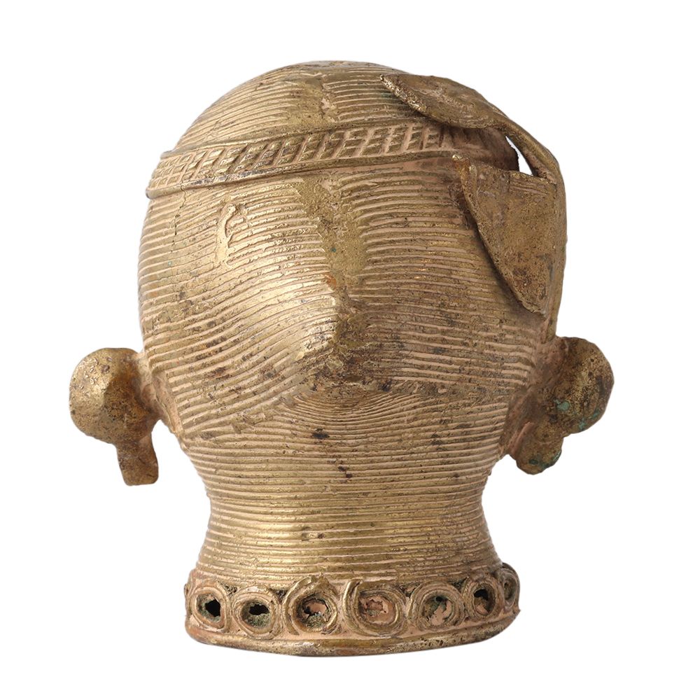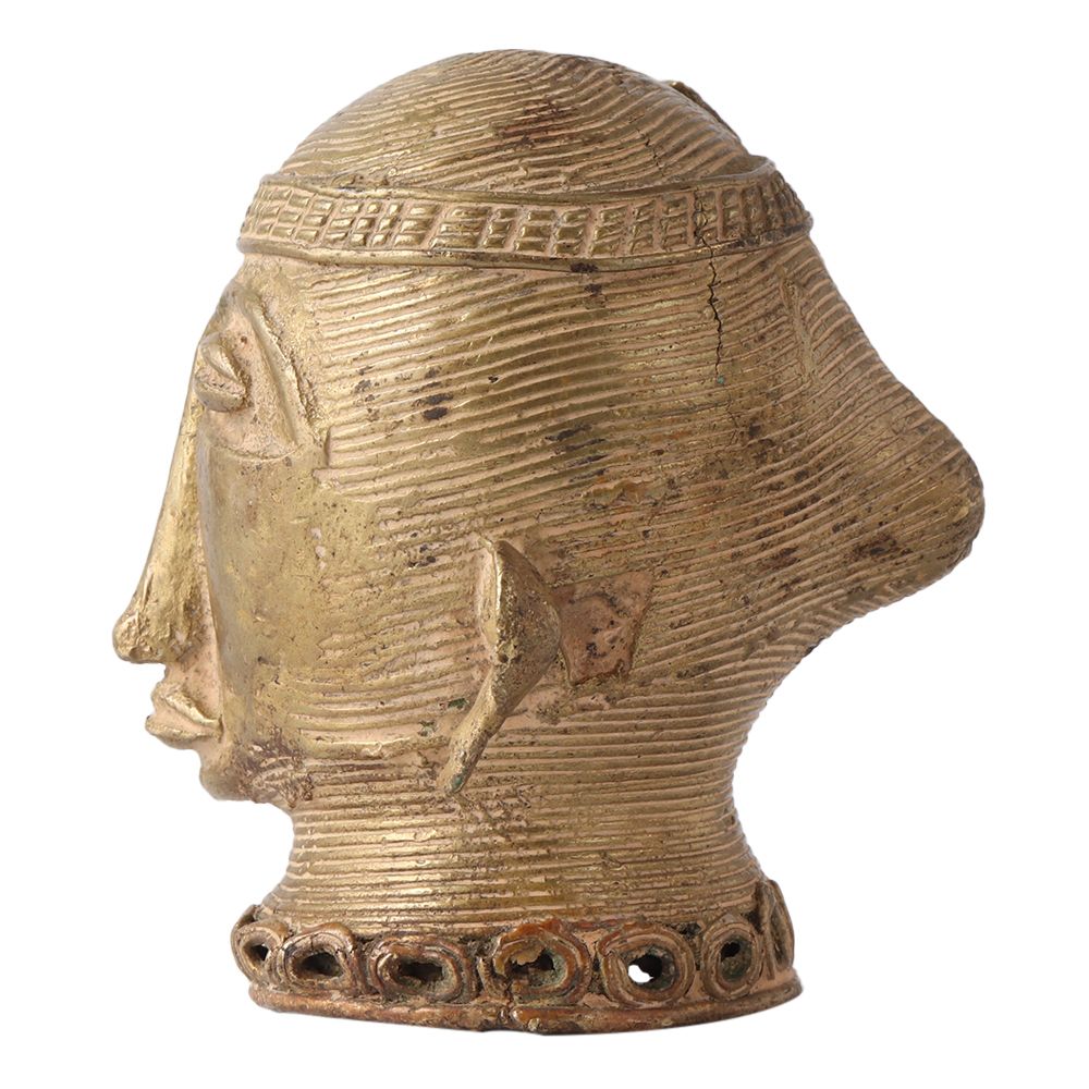 This brass tribal women face statue is found at one of the largest tribal populations in India in the forested district of Bastar. The area is renowned for producing a variety of creative sculptures, the most popular of which are their brass and copper figurines. Traditional tribal themes including paisley patterns and alternate line designs are intricately carved into these pieces. This early 20th-century antique piece is a collector's addition. Use it as house décor or give it as a gift to friends and family.