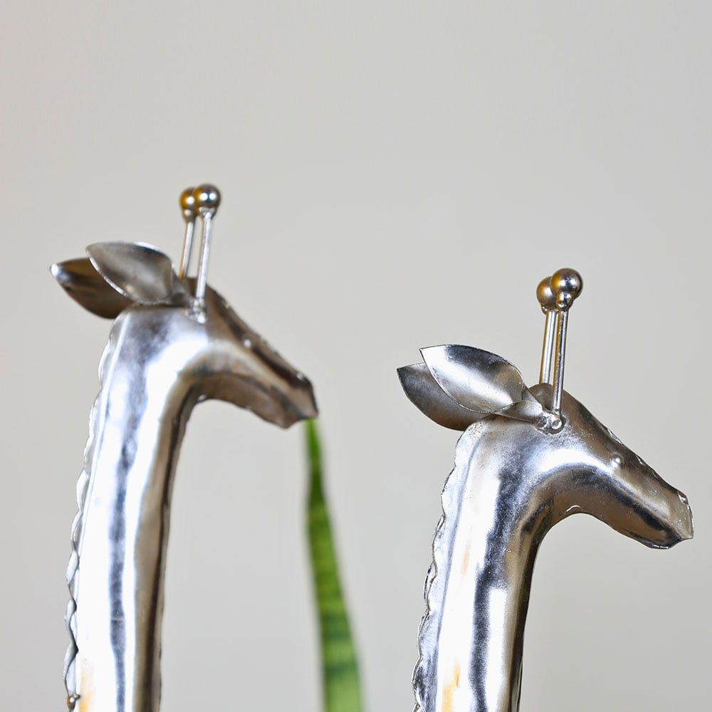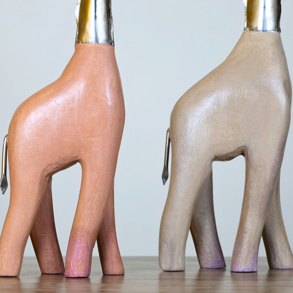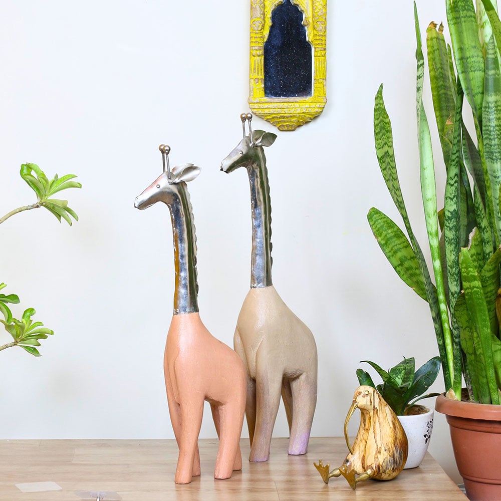 Elevate your dcor with this pair of giraffe sculptures featuring sleek hand-carved wooden bodies and hand-shaped metal necks and heads. The sustainable craftsmanship and rustic-meets-boho design capture the essence of jungle-inspired art, appealing to wildlife admirers, stylists, and curated gift seekers. Their minimalist silhouettes add height and drama. Packed & quality-checked by Indianshelf.