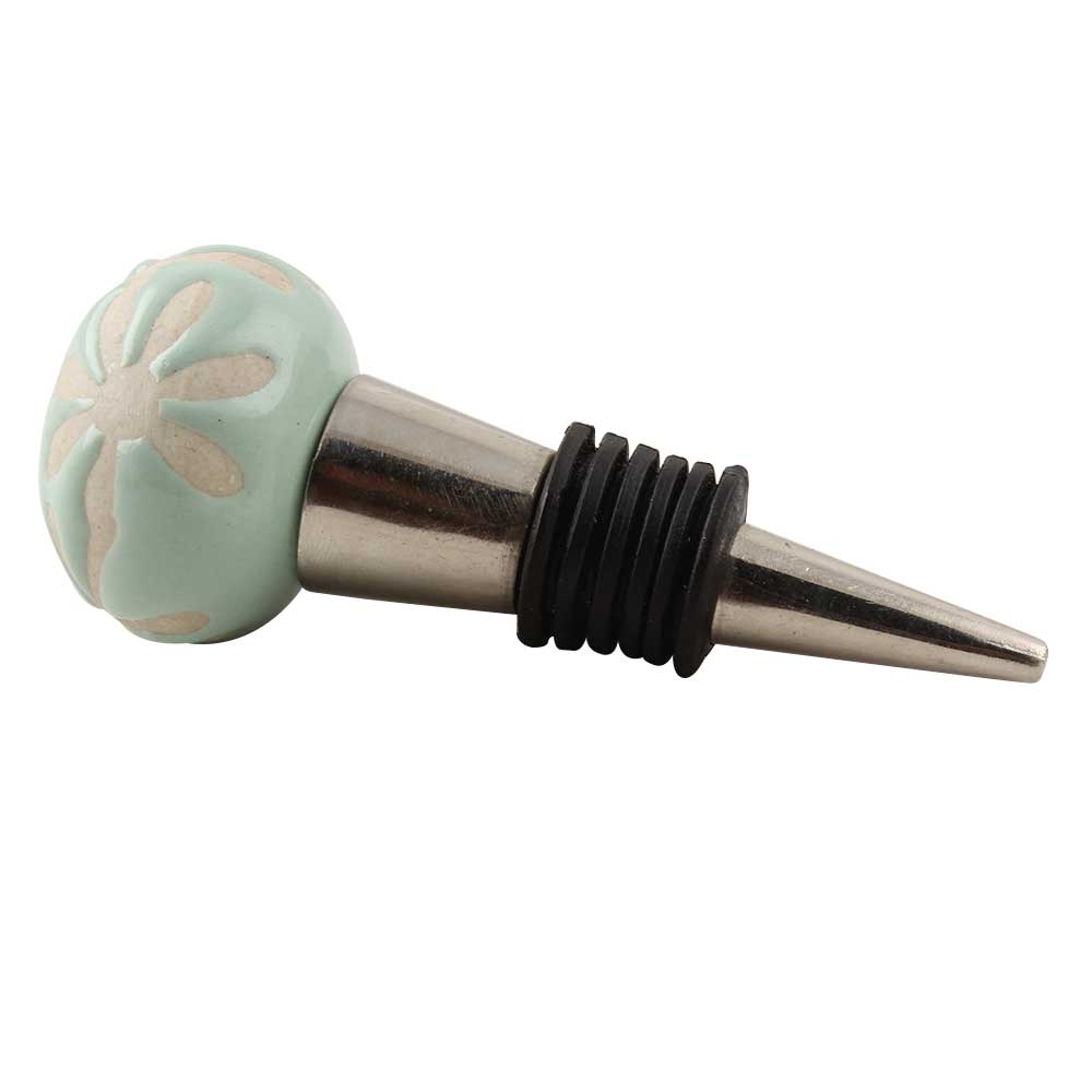 Sage Green Etched Ceramic Floral Wine Stopper. Zinc Alloy Wine Bottle Stopper with Attractive Jute Bag Packaging.