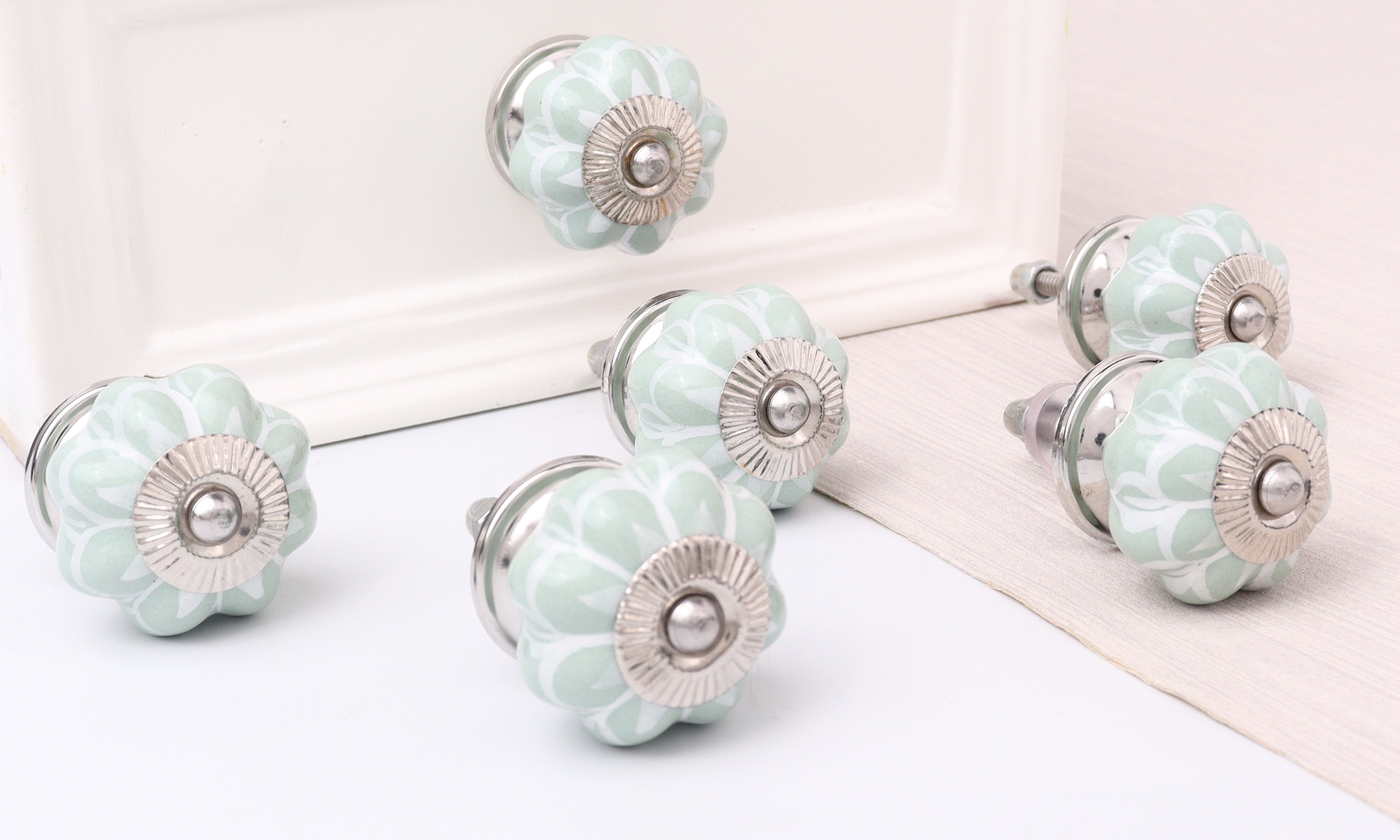 Indianshelf.com for bulk/wholesale orders.Indianshelf.us for personal purchases.This Sage Green Flower Medium Ceramic Melon Cabinet Knob adds a refreshing, nature-inspired element to any cabinet or drawer. The soft sage green hue, paired with a lovely floral pattern, creates a stylish and elegant appearance that fits seamlessly with both modern and traditional home decor. Its melon-inspired shape introduces a unique texture, making it a standout feature in any room.