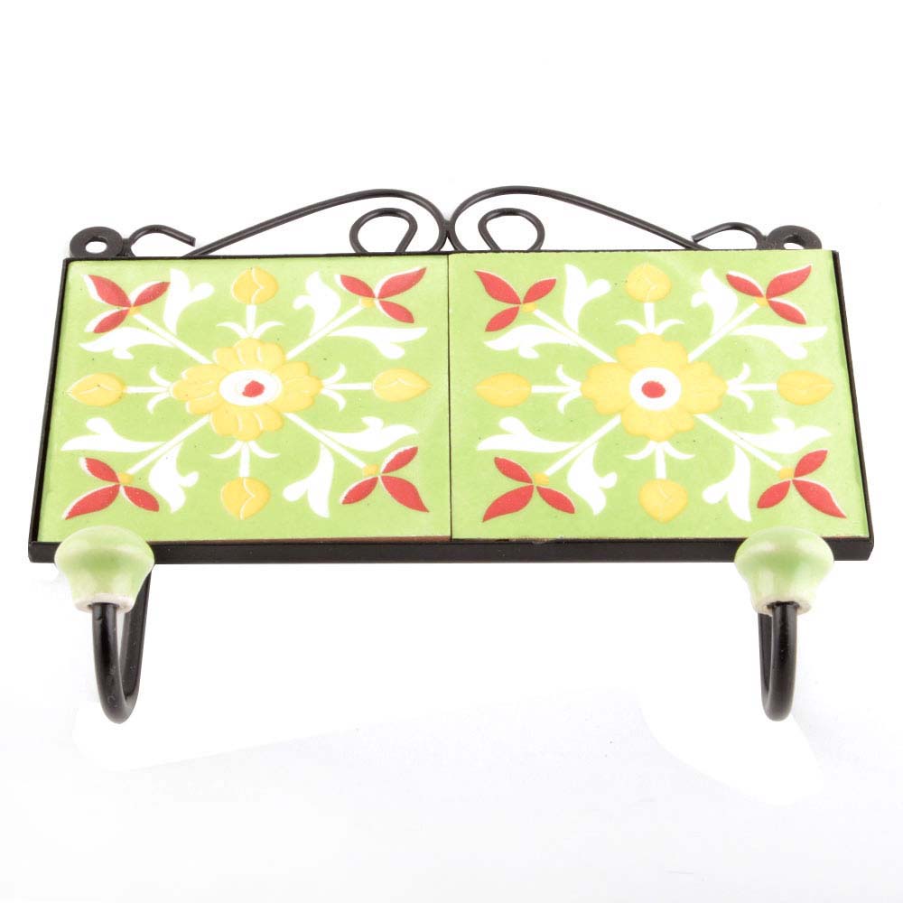 Sage Green Yellow Floral Tiles Hooks. When Put on Wall or Cabinet it is an Art in itself. The Metal Part of this Hook is Black Powder Coated.