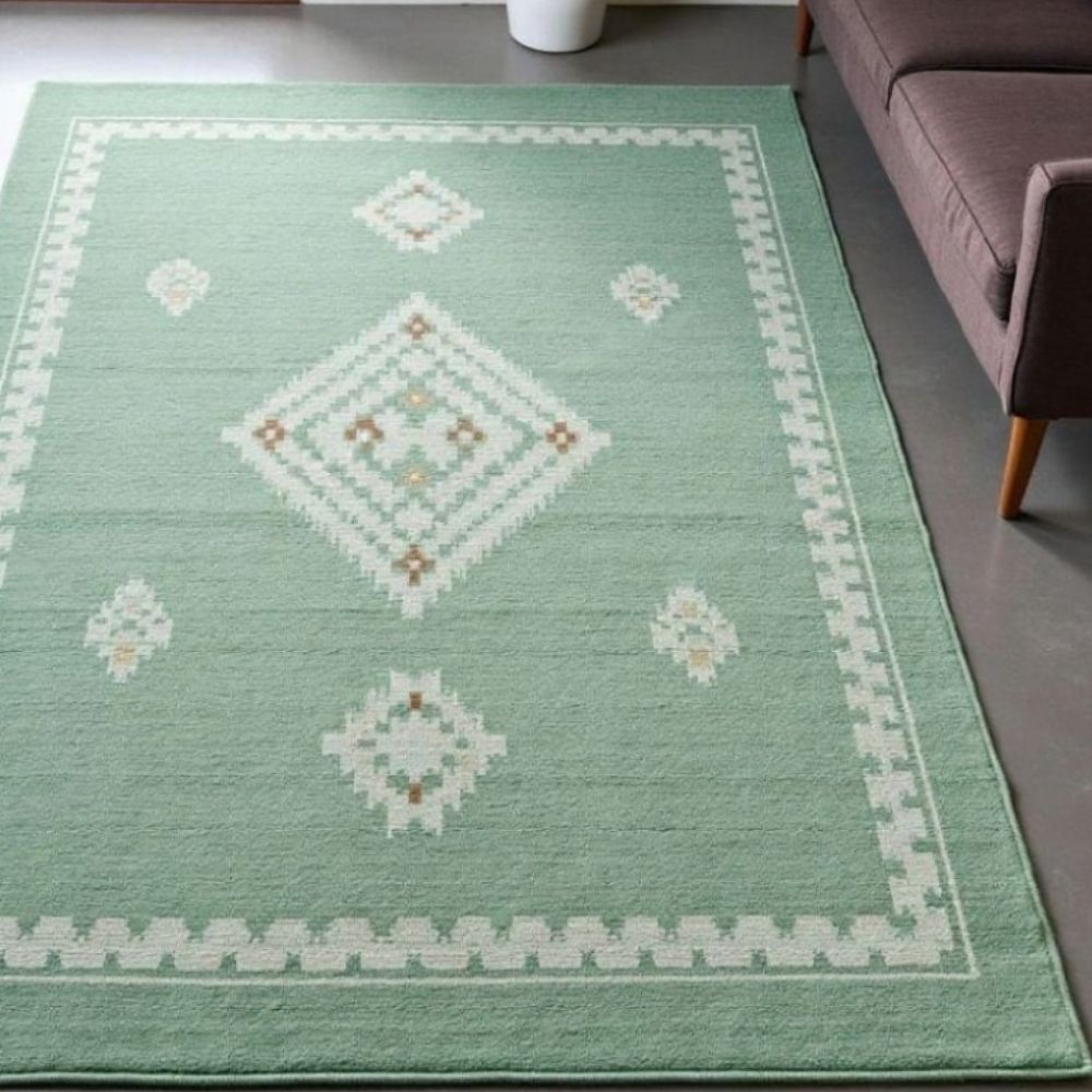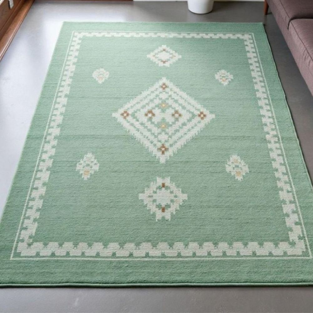 Each knot is tied by hand, making this rug not just a floor covering but a piece of art that reflects heritage, patience, and dedication. Rug Highlights Design: Minimalist geometric motifs in soft ivory and subtle brown accents placed over a soothing green base. The diamond-centered pattern and detailed border create balance and symmetry, giving your space a refined yet cozy feel. Unlike machine-made rugs, hand-knotted rugs are unique, with every piece holding its own character. Material: Premium natural wool, known for its resilience, comfort, and ability to regulate room temperature. Wool fibers are naturally stain-resistant and eco-friendly. Texture & Feel: Soft underfoot with a medium pile height, perfect for walking barefoot or layering in your living room, bedroom, or study. Durability: Made to withstand daily use while retaining its beauty for generations. With proper care, this rug can become a family heirloom. Colors: Calming pastel green base with ivory geometric motifs and delicate hints of brown. These tones blend seamlessly into modern, bohemian, or Scandinavian-inspired interiors. Sizes Available (Customizable) We offer standard sizes for this rug, but since it.