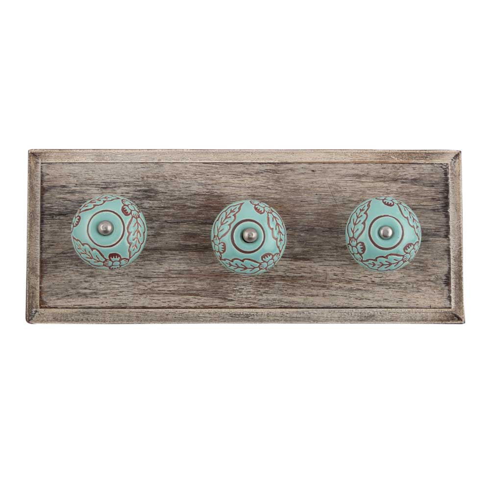 Sea Green Brown Leaf Flower Etched Ceramic Wooden Hooks