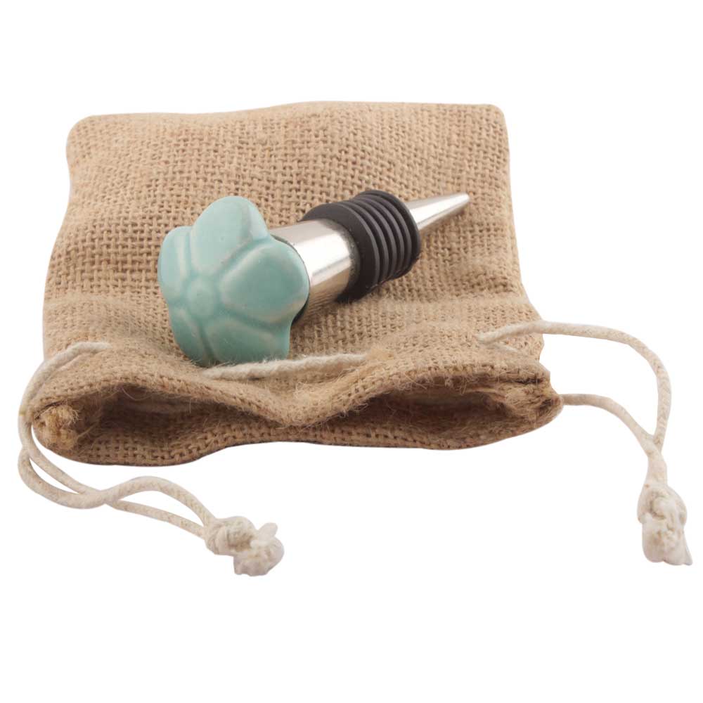 Sea Green Ceramic Flower Wine Stopper. Zinc Alloy Wine Bottle Stopper with Attractive Jute Bag Packaging.