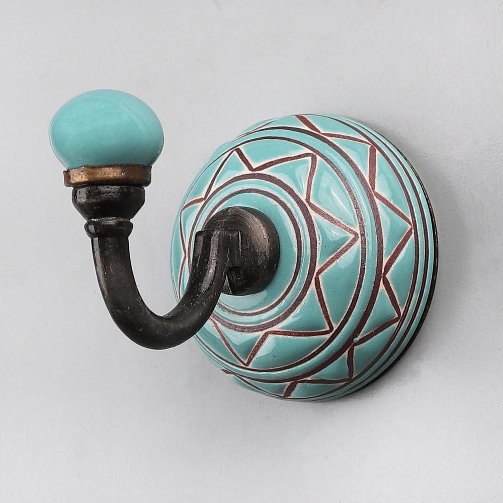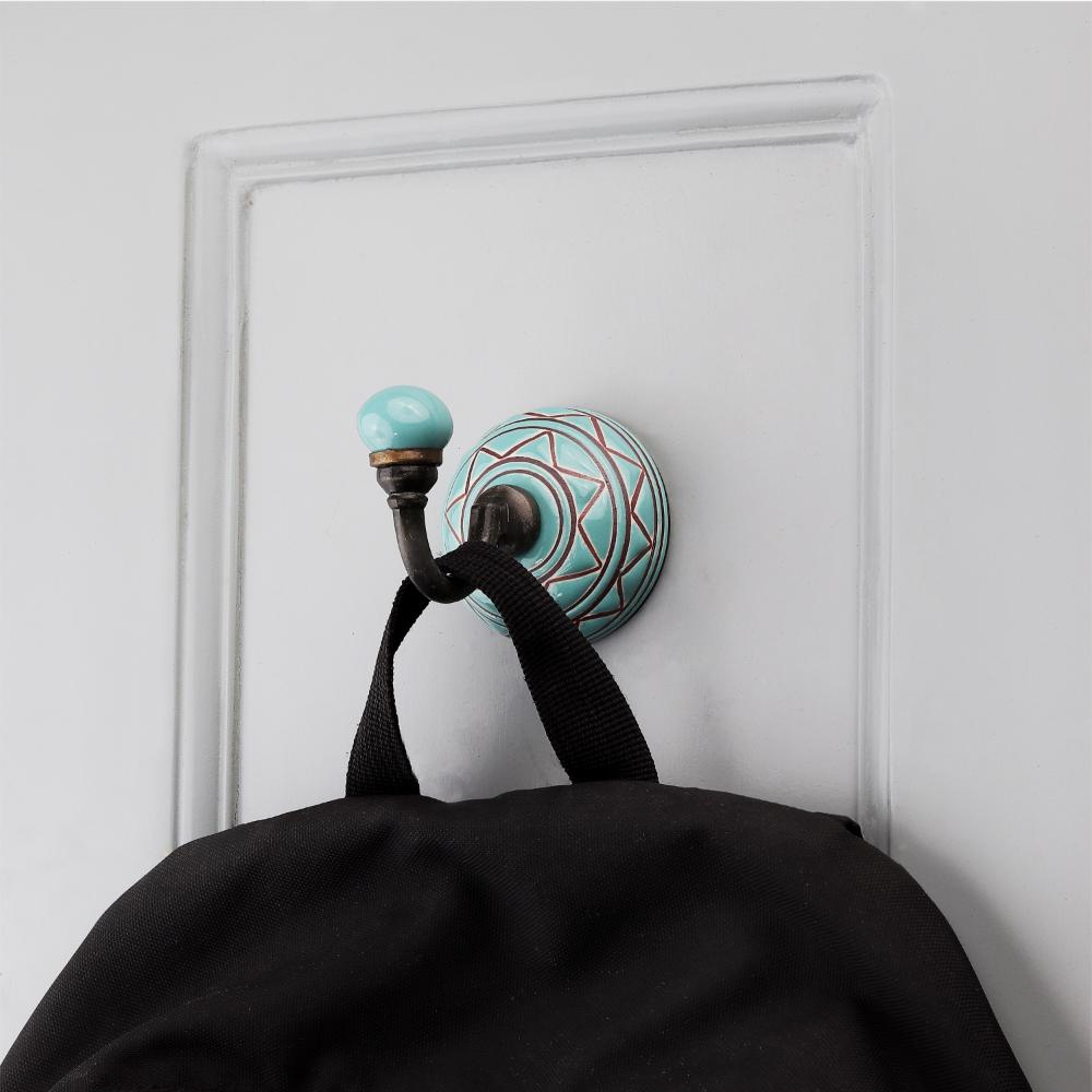 Material: Glazed ceramic top + metal hook base Finish: Glossy sea green glaze with hand-etched detailing Installation: Screw-in wall mount with included hardware