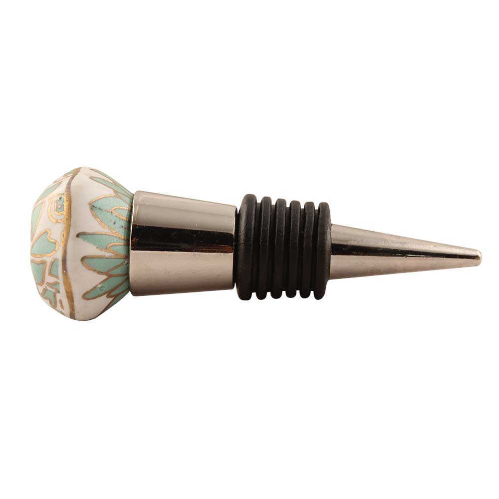 Sea Green Hexagon Small Ceramic Wine Stopper. Zinc Alloy Wine Bottle Stopper with Attractive Jute Bag Packaging.