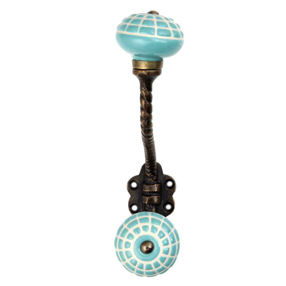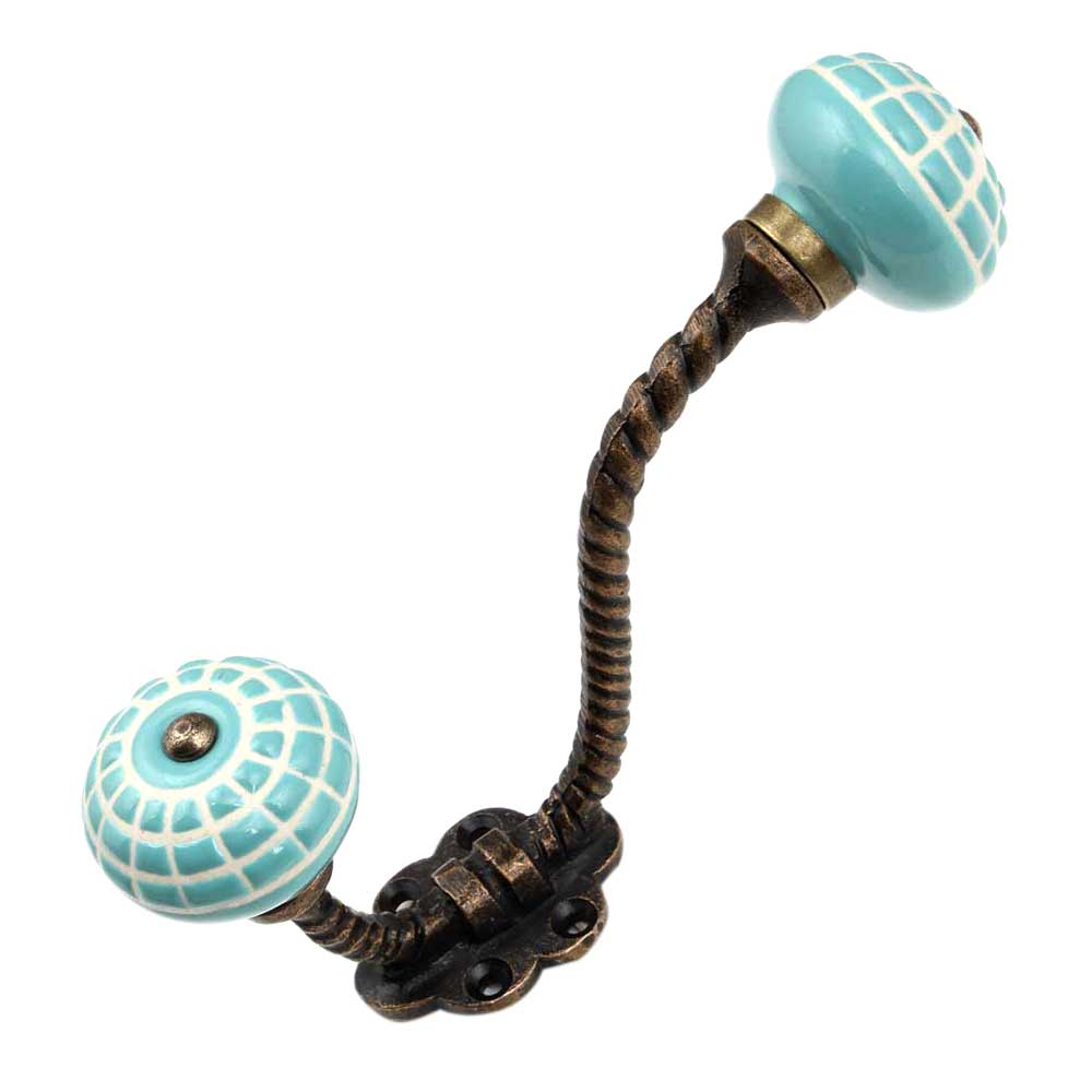 Material: Hand-etched glazed ceramic knob and wrought iron rope-textured hook