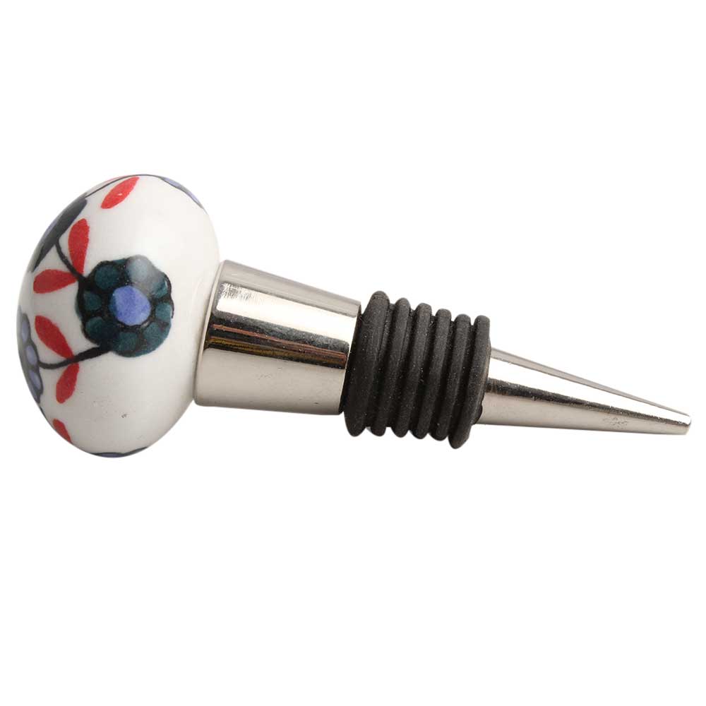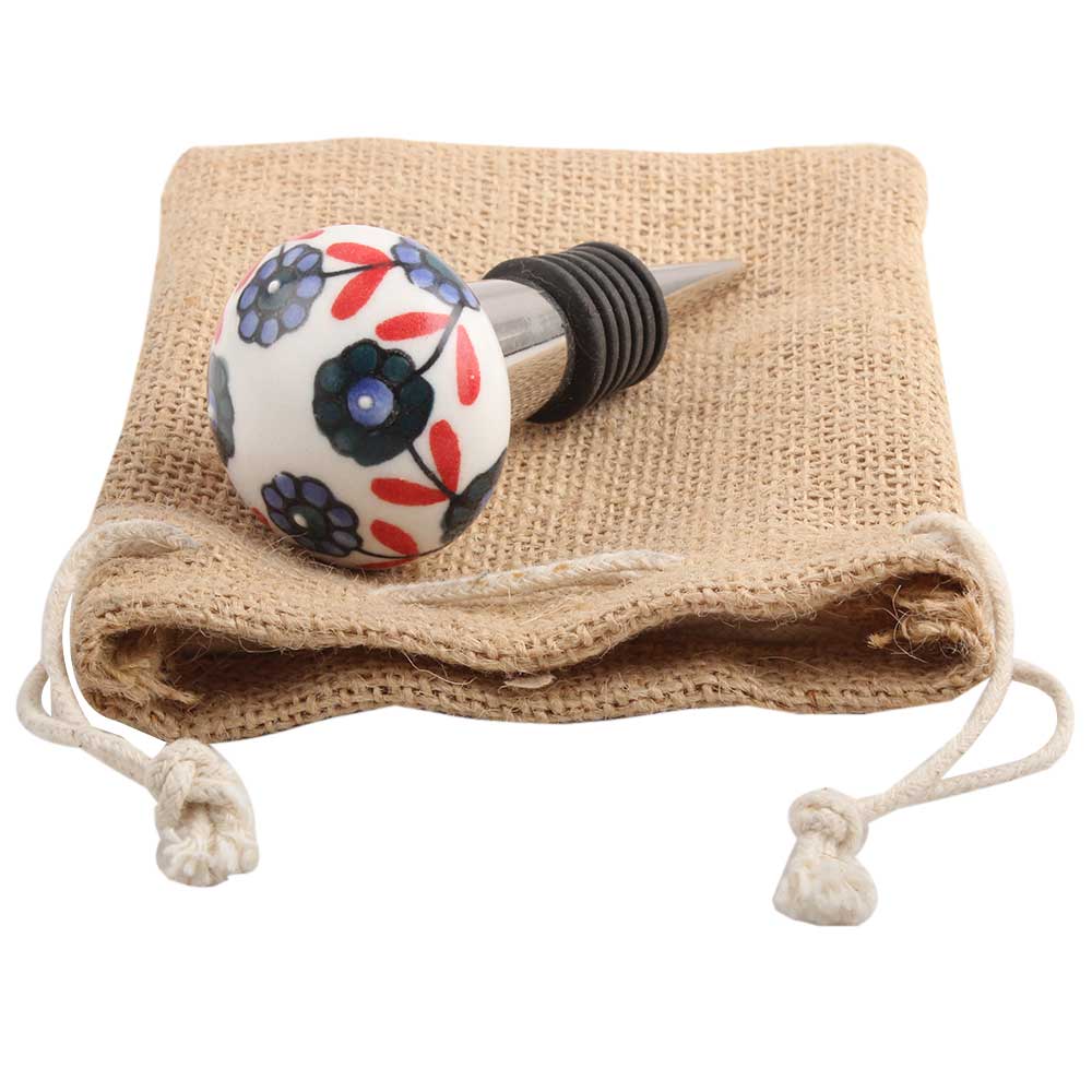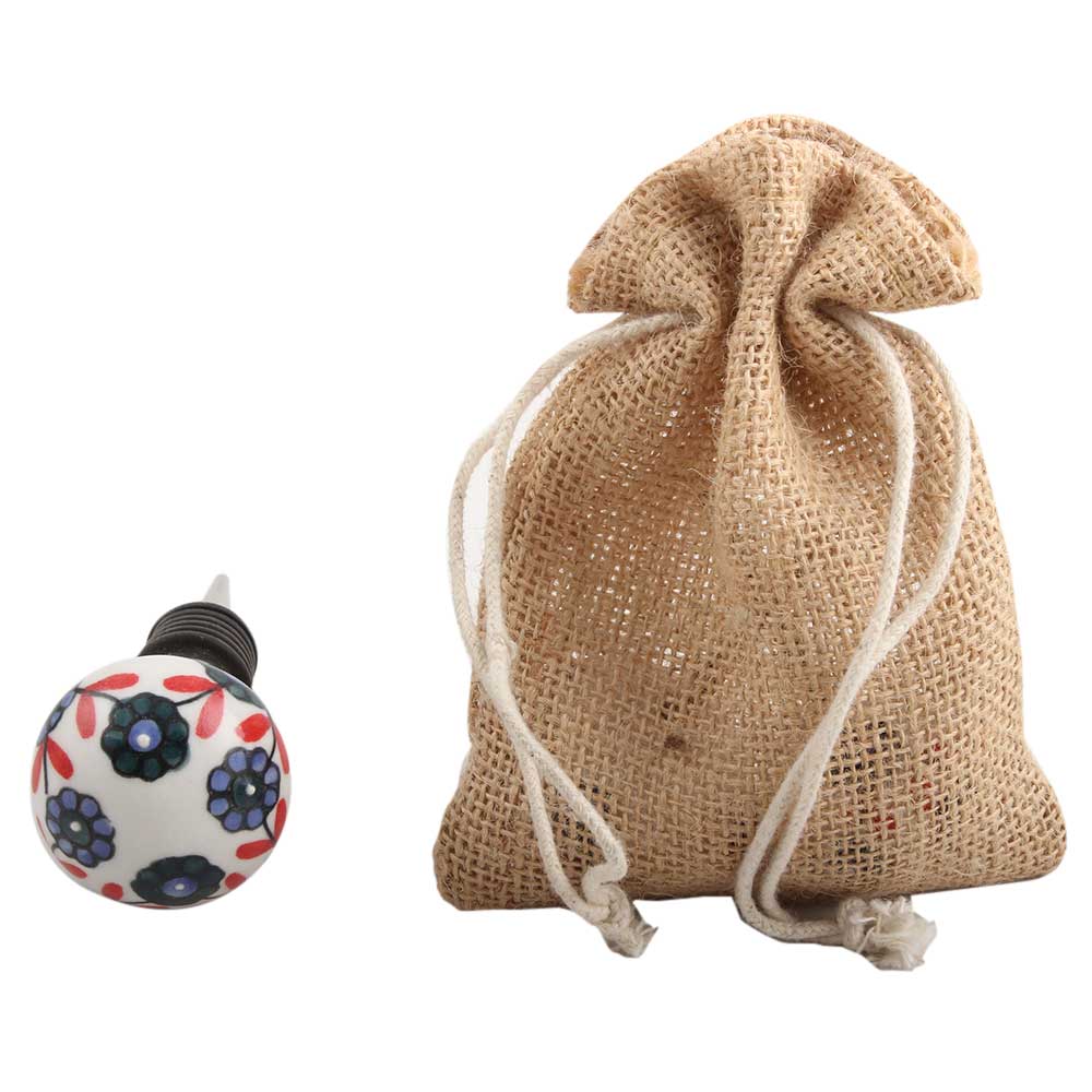 Sea Green Tiny Flower Ceramic Wine Stopper. Zinc Alloy Wine Bottle Stopper with Attractive Jute Bag Packaging.