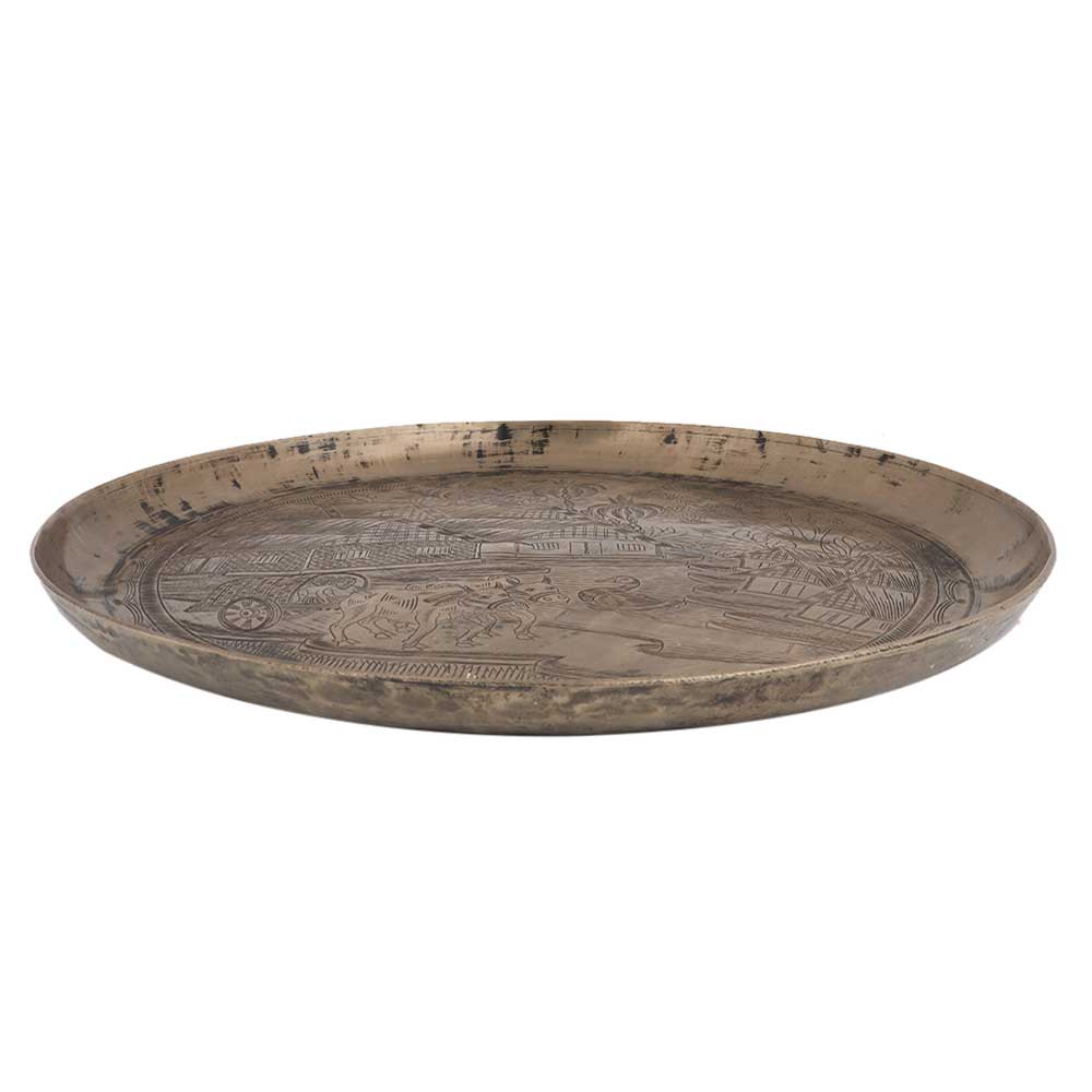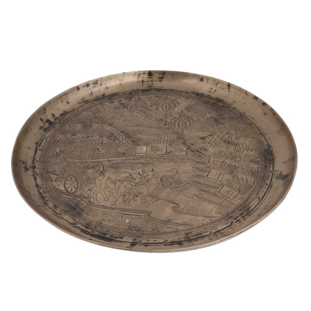 • Serving Tray or Plate Engraved with Indian Village Scene In Bell Metal