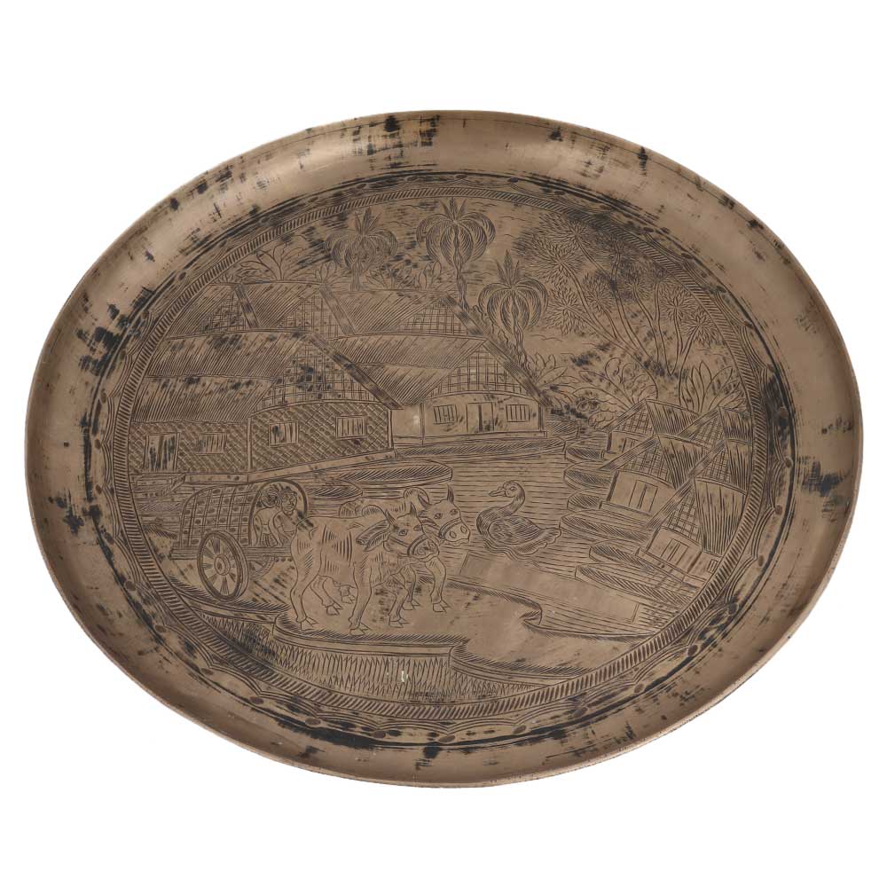 Serving Tray or Plate Engraved with Indian Village Scene In Bell Metal