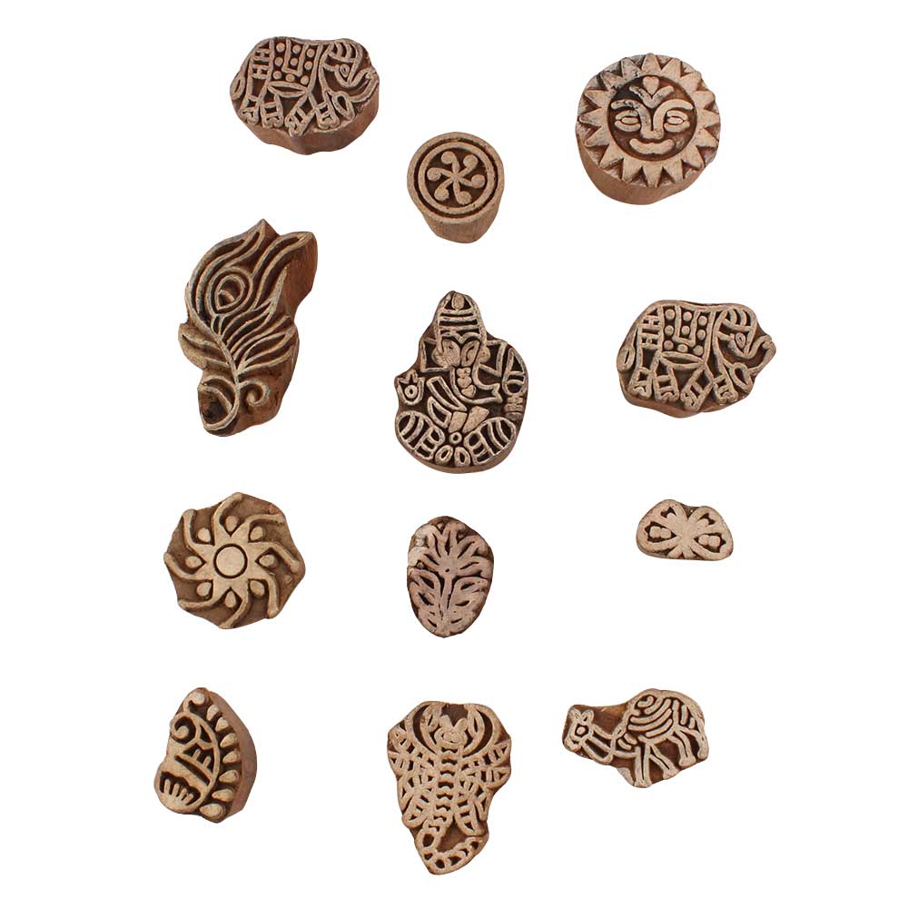 Set of 12 Piece New Mix Wooden Printing Blocks. Ideal for use on Fabric, Paper, Canvas, etc. These Blocks can be use to Print with Oil Colors, Fabric Colors, Water Colors, Acrylic Colors and Vegetable Colors.