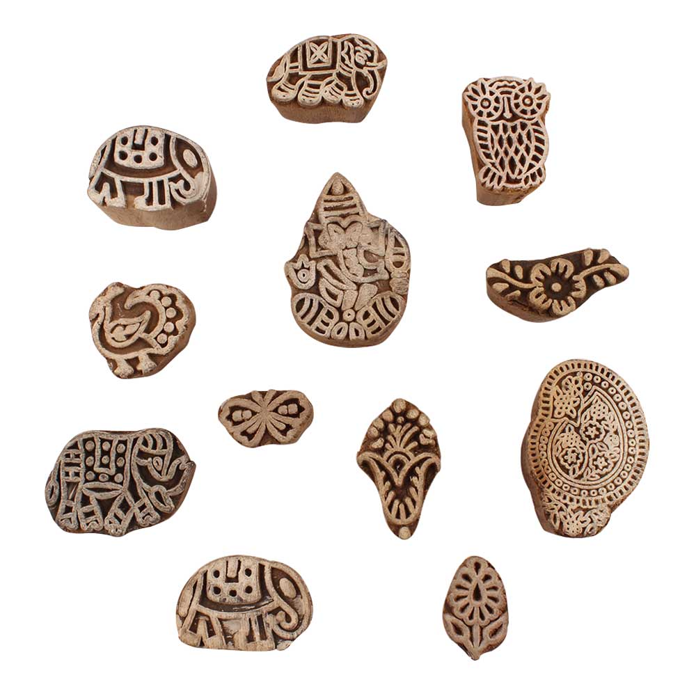 Set of 12 Piece New Mix Wooden Printing Blocks. Ideal for use on Fabric, Paper, Canvas, etc. These Blocks can be use to Print with Oil Colors, Fabric Colors, Water Colors, Acrylic Colors and Vegetable Colors.