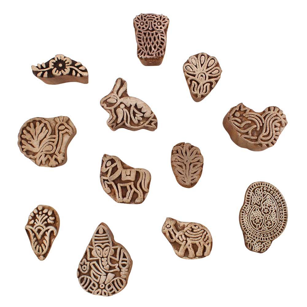 Set of 12 Piece New Mix Wooden Printing Blocks. Ideal for use on Fabric, Paper, Canvas, etc. These Blocks can be use to Print with Oil Colors, Fabric Colors, Water Colors, Acrylic Colors and Vegetable Colors.