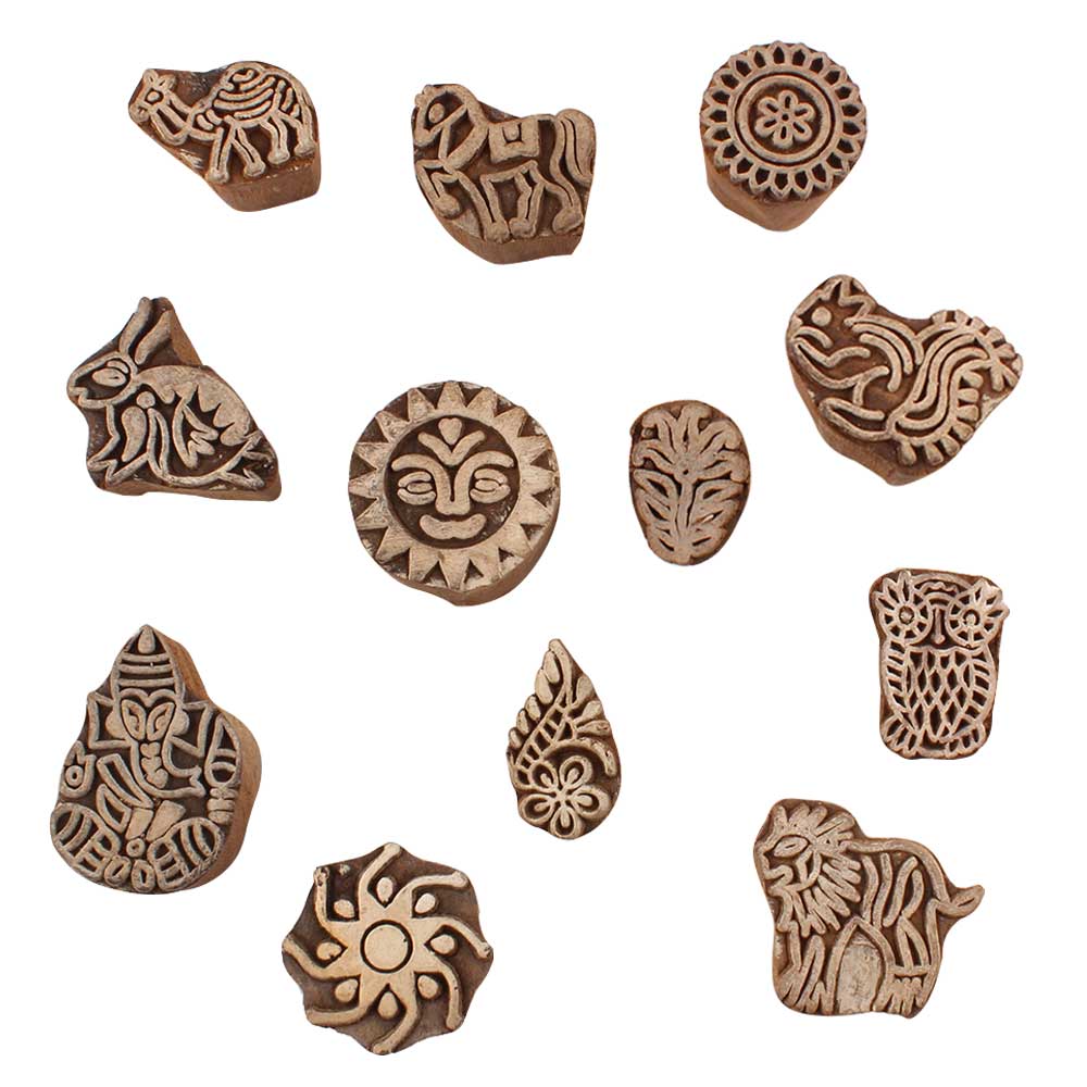 Set of 12 Piece New Mix Wooden Printing Blocks. Ideal for use on Fabric, Paper, Canvas, etc. These Blocks can be use to Print with Oil Colors, Fabric Colors, Water Colors, Acrylic Colors and Vegetable Colors.
