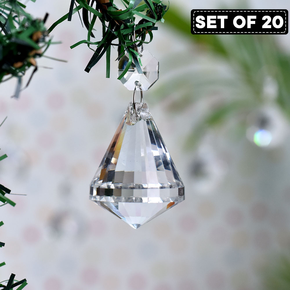 Indianshelf.com for bulk/wholesale orders.Indianshelf.us for personal purchases.Enhance your holiday décor with this exquisite set of 20 Clear Crystal Glass Faceted Diamond Christmas Ornaments. Each ornament showcases a stunning diamond design that beautifully captures and reflects light, creating a captivating display. Ideal for chandeliers, Christmas trees, or any festive arrangement, these ornaments infuse your home with elegance and charm.