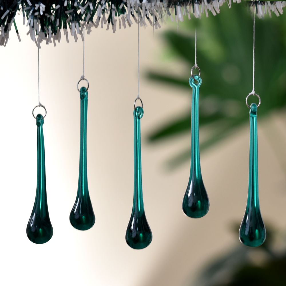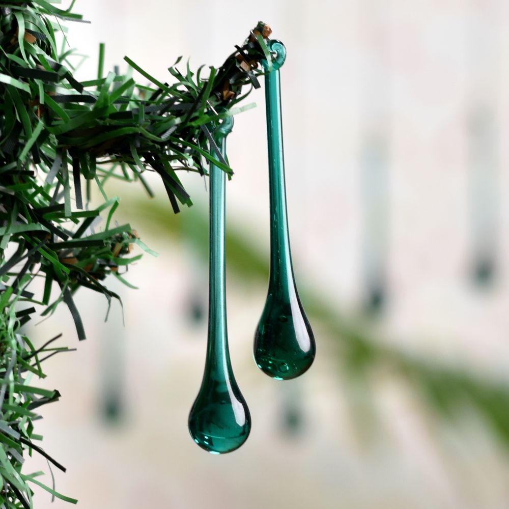 Each ornament in this set is carefully crafted from high-quality glass with a deep green color that mimics the richness of pine trees. The chandelier drop shape adds a luxurious, elongated look, reminiscent of classic chandelier crystals, making them ideal for creating a refined and festive atmosphere. These ornaments are perfect for those who appreciate both tradition and sophistication in their holiday decor.
