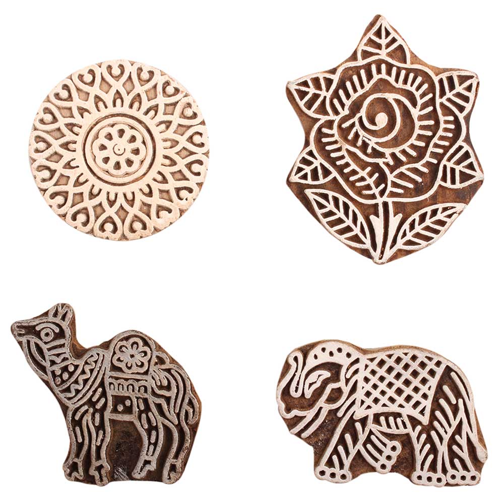 Set of 4 Piece New Mix Wooden Printing Block. Ideal for use on Fabric, Paper, Canvas, etc. These Blocks can be use to Print with Oil Colors, Fabric Colors, Water Colors, Acrylic Colors and Vegetable Colors.