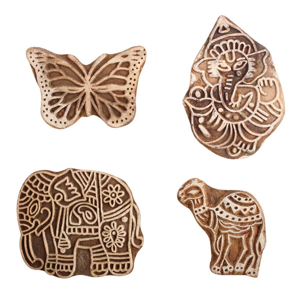 Set of 4 Piece New Mix Wooden Printing Block. Ideal for use on Fabric, Paper, Canvas, etc. These Blocks can be use to Print with Oil Colors, Fabric Colors, Water Colors, Acrylic Colors and Vegetable Colors.