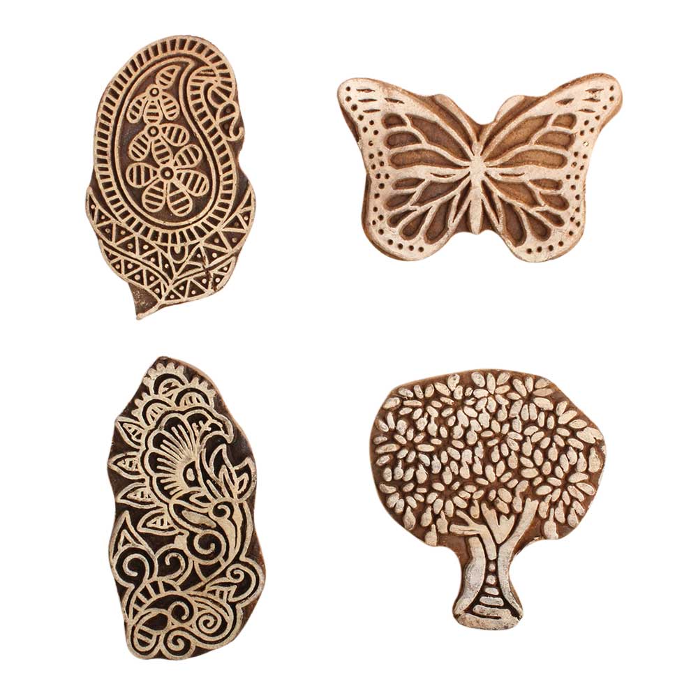 Set of 4 Piece New Mix Wooden Printing Block. Ideal for use on Fabric, Paper, Canvas, etc. These Blocks can be use to Print with Oil Colors, Fabric Colors, Water Colors, Acrylic Colors and Vegetable Colors.
