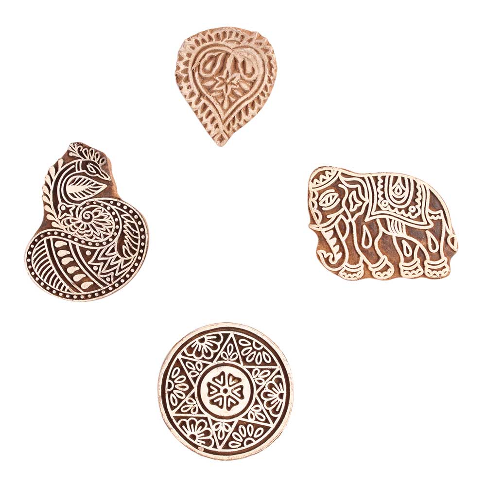 Set of 4 Piece New Mix Wooden Printing Block. Ideal for use on Fabric, Paper, Canvas, etc. These Blocks can be use to Print with Oil Colors, Fabric Colors, Water Colors, Acrylic Colors and Vegetable Colors.