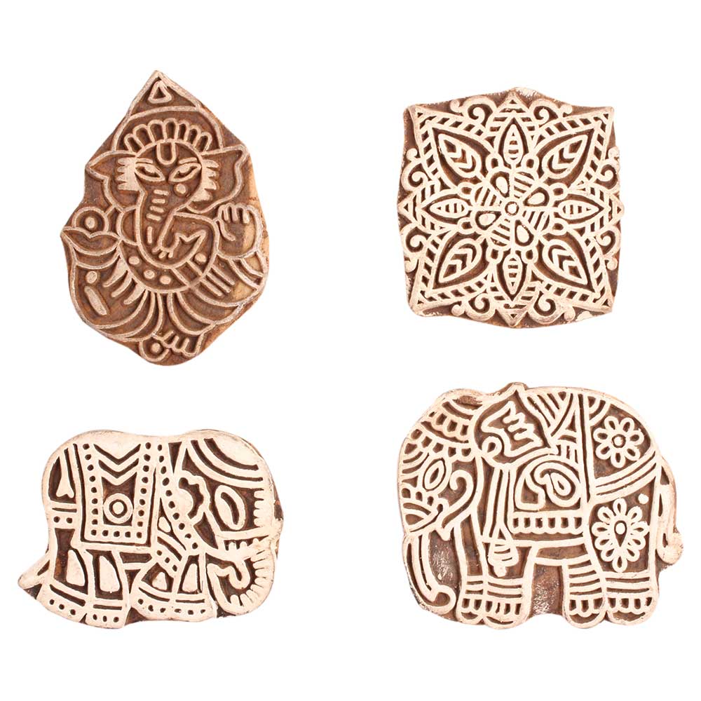 Set of 4 Piece New Mix Wooden Printing Block. Ideal for use on Fabric, Paper, Canvas, etc. These Blocks can be use to Print with Oil Colors, Fabric Colors, Water Colors, Acrylic Colors and Vegetable Colors.