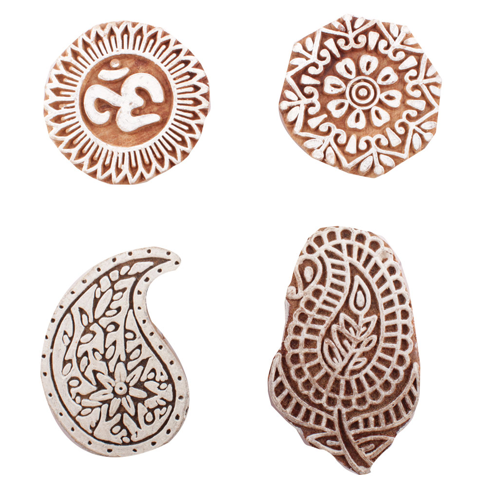 Set of 4 Piece New Mix Wooden Printing Block. Ideal for use on Fabric, Paper, Canvas, etc. These Blocks can be use to Print with Oil Colors, Fabric Colors, Water Colors, Acrylic Colors and Vegetable Colors.
