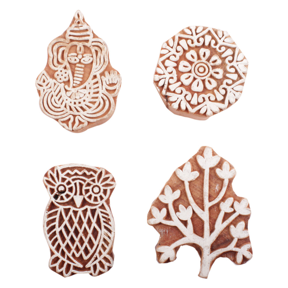 Set of 4 Piece New Mix Wooden Printing Block. Ideal for use on Fabric, Paper, Canvas, etc. These Blocks can be use to Print with Oil Colors, Fabric Colors, Water Colors, Acrylic Colors and Vegetable Colors.