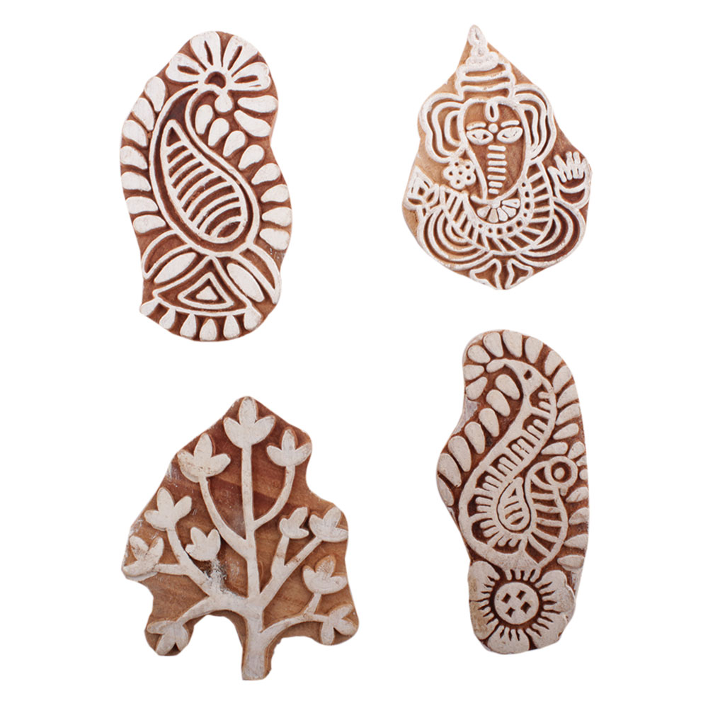 Set of 4 Piece New Mix Wooden Printing Block. Ideal for use on Fabric, Paper, Canvas, etc. These Blocks can be use to Print with Oil Colors, Fabric Colors, Water Colors, Acrylic Colors and Vegetable Colors.