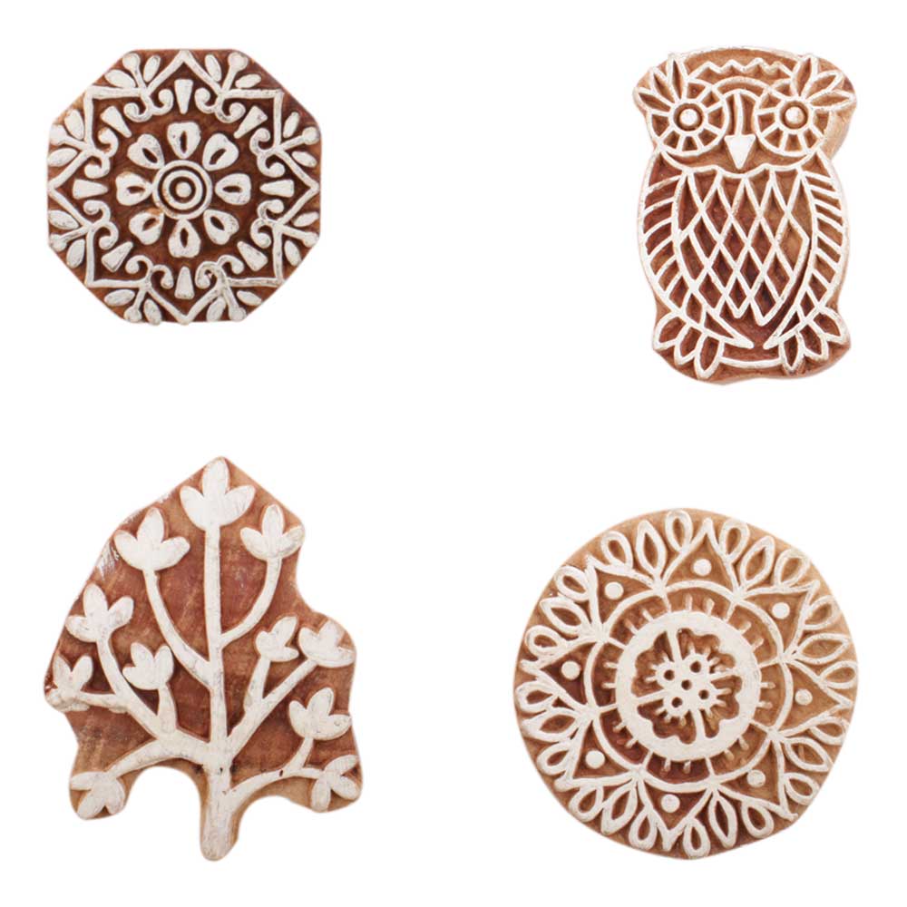 Set of 4 Piece New Mix Wooden Printing Block. Ideal for use on Fabric, Paper, Canvas, etc. These Blocks can be use to Print with Oil Colors, Fabric Colors, Water Colors, Acrylic Colors and Vegetable Colors.
