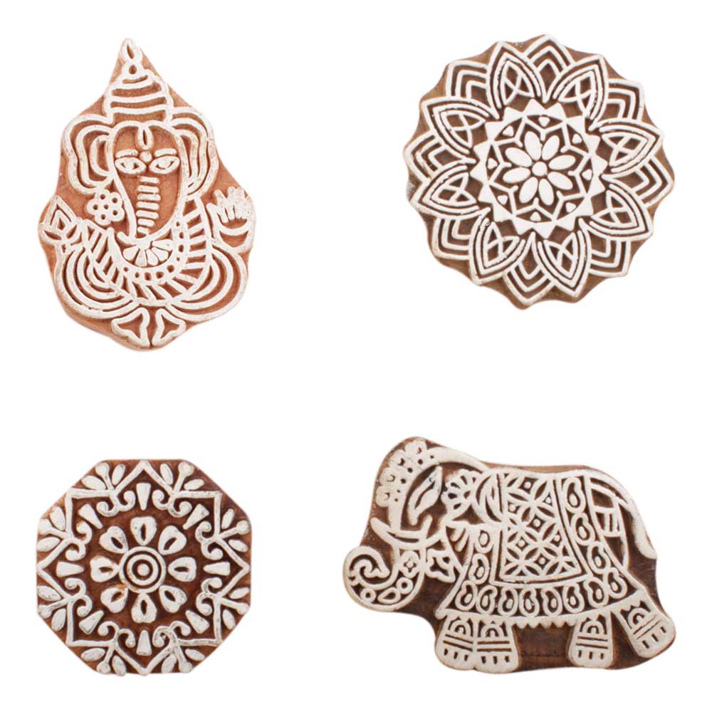 Set of 4 Piece New Mix Wooden Printing Block. Ideal for use on Fabric, Paper, Canvas, etc. These Blocks can be use to Print with Oil Colors, Fabric Colors, Water Colors, Acrylic Colors and Vegetable Colors.