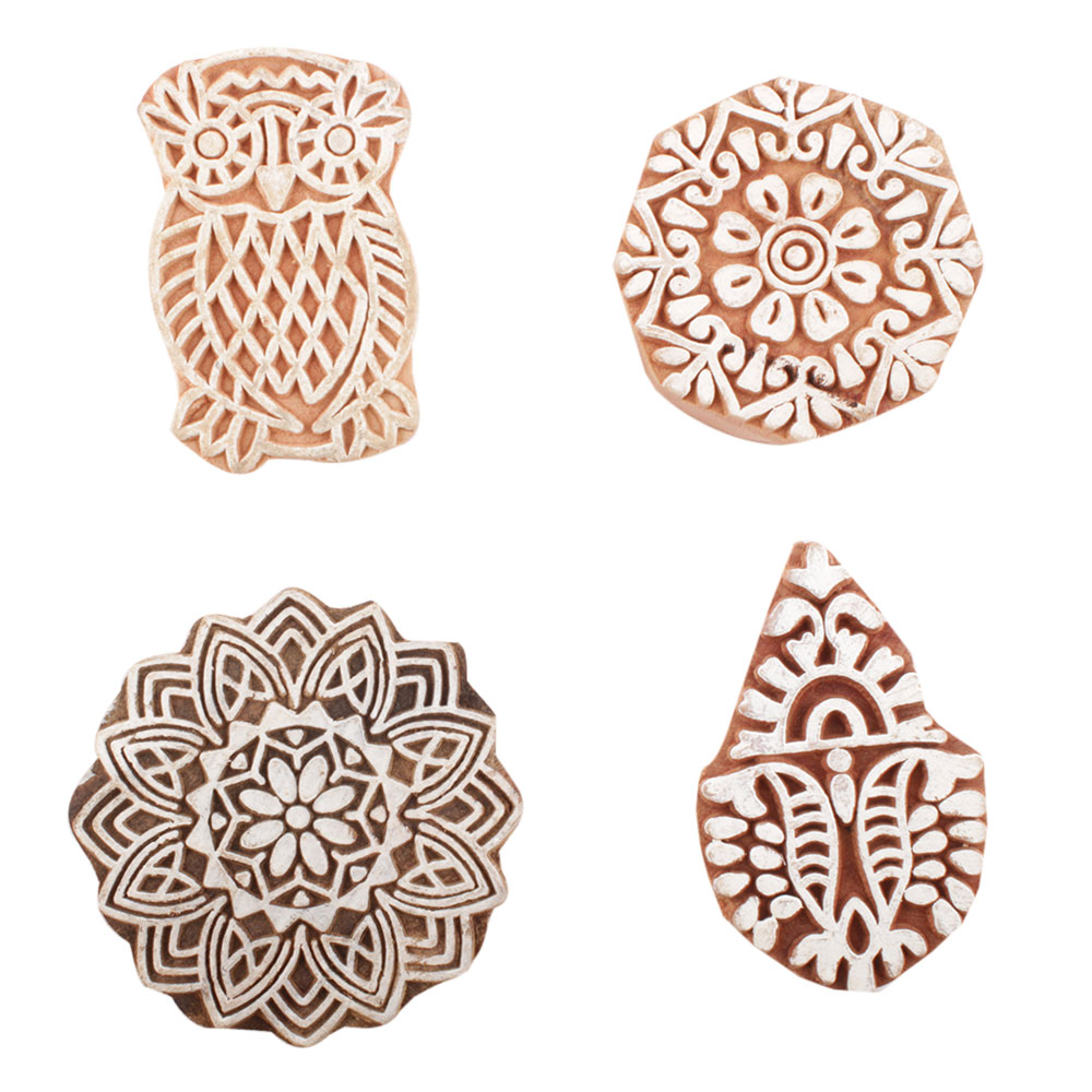 Set of 4 Piece New Mix Wooden Printing Block. Ideal for use on Fabric, Paper, Canvas, etc. These Blocks can be use to Print with Oil Colors, Fabric Colors, Water Colors, Acrylic Colors and Vegetable Colors.