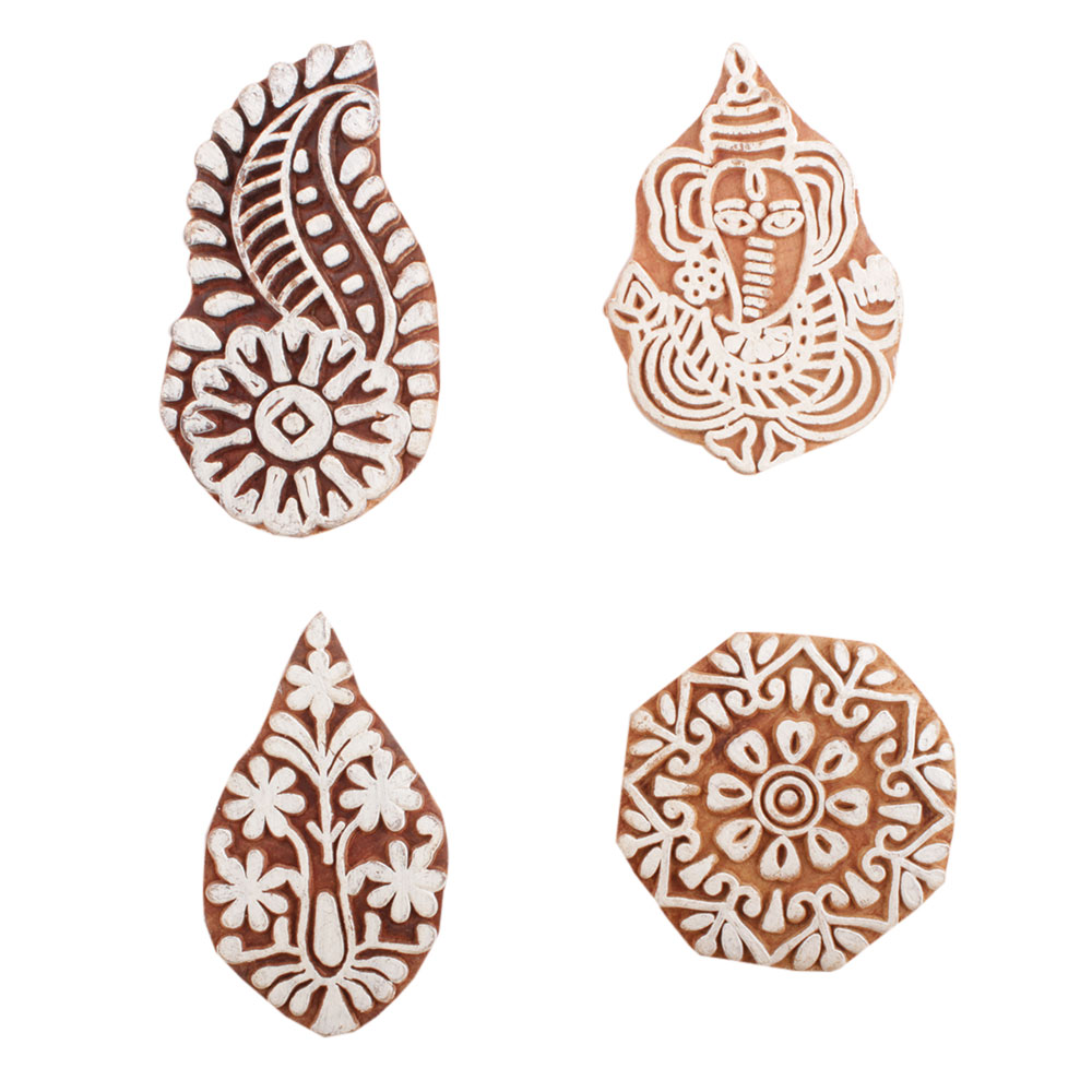 Set of 4 Piece New Mix Wooden Printing Block. Ideal for use on Fabric, Paper, Canvas, etc. These Blocks can be use to Print with Oil Colors, Fabric Colors, Water Colors, Acrylic Colors and Vegetable Colors.