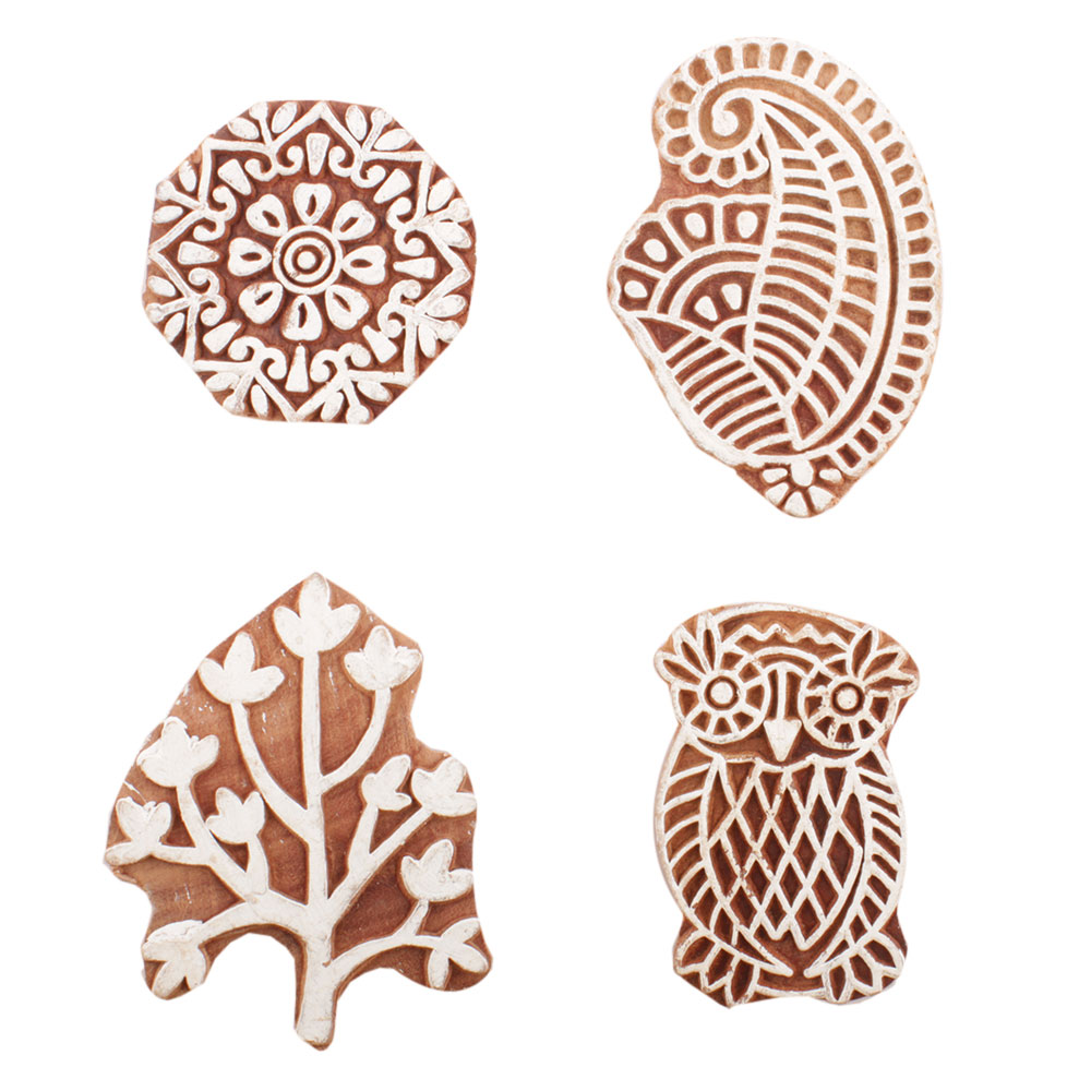 Set of 4 Piece New Mix Wooden Printing Block. Ideal for use on Fabric, Paper, Canvas, etc. These Blocks can be use to Print with Oil Colors, Fabric Colors, Water Colors, Acrylic Colors and Vegetable Colors.