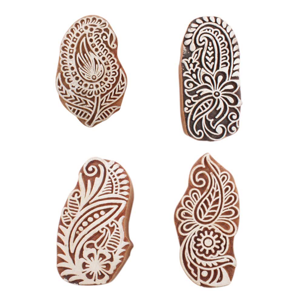 Set of 4 Piece New Mix Wooden Printing Block. Ideal for use on Fabric, Paper, Canvas, etc. These Blocks can be use to Print with Oil Colors, Fabric Colors, Water Colors, Acrylic Colors and Vegetable Colors.