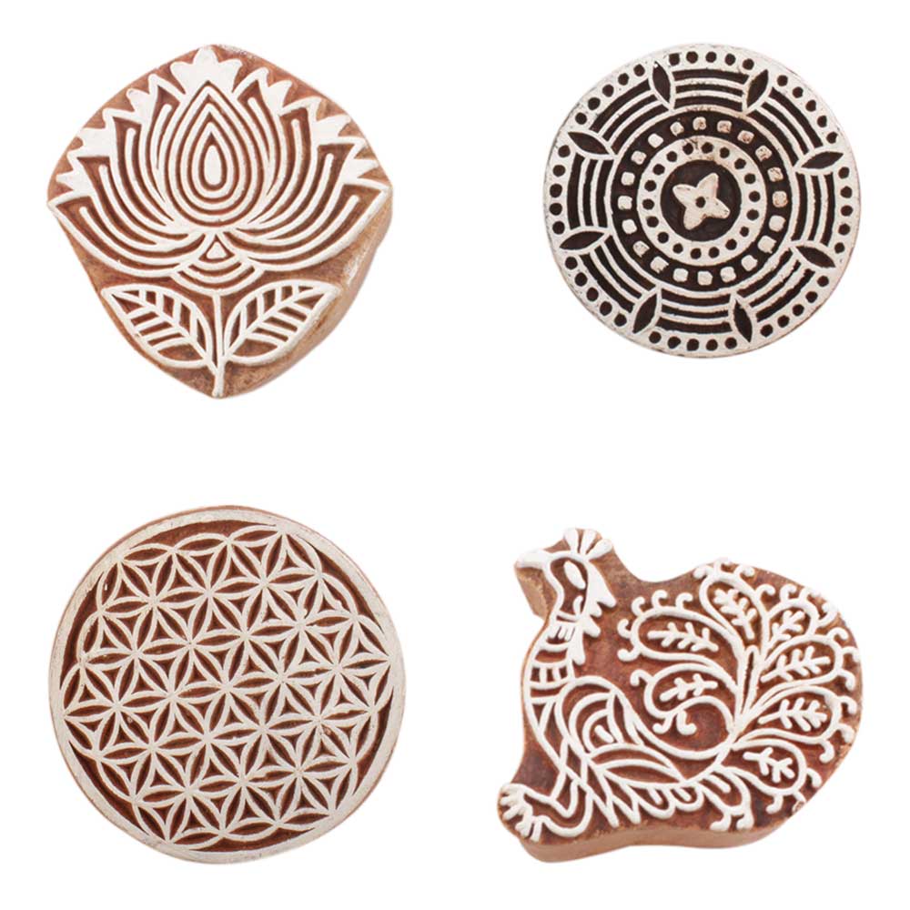 Set of 4 Piece New Mix Wooden Printing Block. Ideal for use on Fabric, Paper, Canvas, etc. These Blocks can be use to Print with Oil Colors, Fabric Colors, Water Colors, Acrylic Colors and Vegetable Colors.