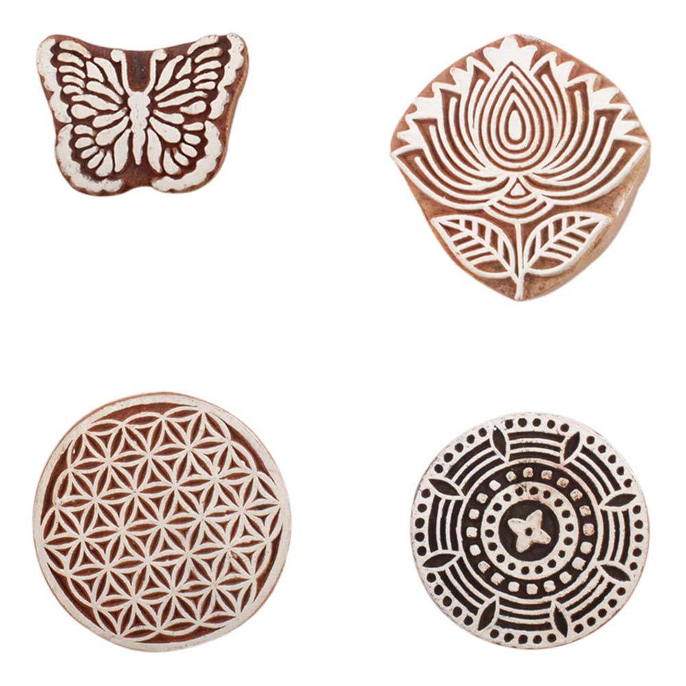 Set of 4 Piece New Mix Wooden Printing Block. Ideal for use on Fabric, Paper, Canvas, etc. These Blocks can be use to Print with Oil Colors, Fabric Colors, Water Colors, Acrylic Colors and Vegetable Colors.