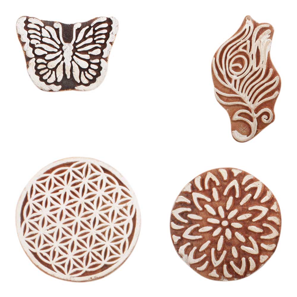 Set of 4 Piece New Mix Wooden Printing Block. Ideal for use on Fabric, Paper, Canvas, etc. These Blocks can be use to Print with Oil Colors, Fabric Colors, Water Colors, Acrylic Colors and Vegetable Colors.